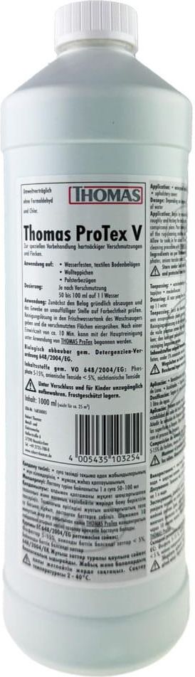 ProTex V - profesjonalny niemiecki koncentrat płynu do prania silnych zabrudzeń Szukasz skutecznego płynu do prania dywanów, wykładzin i tapicerek? ProTex V to wysokiej jakości niemiecki koncentrat stworzony do usuwania trudnych zabrudzeń, plam i zanieczyszczeń z powierzchni tekstylnych. Ten zestaw zawiera jedną butelkę koncentratu 1 litr, co zapewnia wydajne czyszczenie dużych powierzchni. Dlaczego warto wybrać ProTex V? Profesjonalna formuła opracowana w Niemczech. Doskonały do usuwania plam, zabrudzeń i nieprzyjemnych zapachów. Bezpieczny dla różnego rodzaju powierzchni tekstylnych – dywanów, wykładzin, tapicerek, pokrowców. Możliwość stosowania w odkurzaczach piorących różnych marek, nie tylko Thomas. Dzięki wysokiej skuteczności ProTex V sprawdzi się w domach, biurach, hotelach oraz wszędzie tam, gdzie czystość tekstyliów jest priorytetem. Instrukcja użycia środka ProTex V Zastosowanie: Preparat przeznaczony jest do czyszczenia: wodoodpornych wykładzin tekstylnych, dywanów wełnianych, pokrowców i tapicerek. Dozowanie: W zależności od stopnia zabrudzenia stosować od 50 do 100 ml koncentratu na 1 litr wody. Sposób użycia: Sprawdź odporność materiału w niewidocznym miejscu. Wlej odmierzoną ilość środka ProTex V do zbiornika czystej wody w odkurzaczu piorącym. Spryskaj czyszczoną powierzchnię roztworem. Odczekaj ok. 10 minut, aby środek zadziałał. Wypierz powierzchnię odkurzaczem piorącym przy użyciu płynu piorącego ProTex THOMAS. Środki ostrożności: Przechowywać w zamkniętym opakowaniu, z dala od dzieci. Chronić przed zamarzaniem. Kompatybilność Płyn pasuje do wszystkich odkurzaczy piorących, w tym:Modele Thomas: Twin T1, T2, TT, MultiClean x10, x7, Pet&Family, Allergy&Family, Amfibia, Amfibia DryBox, Amfibia Pro Animal, Aqua FleckWasher oraz wielu innych modeli dostępnych na rynku. Dane produktu: Pojemność: 1L Kolor etykiety: biały lub żółta w zależności od partii *Zdjęcia poglądowe. Producent THOMAS zastrzega sobie prawo do zmian konstrukcyjnych.