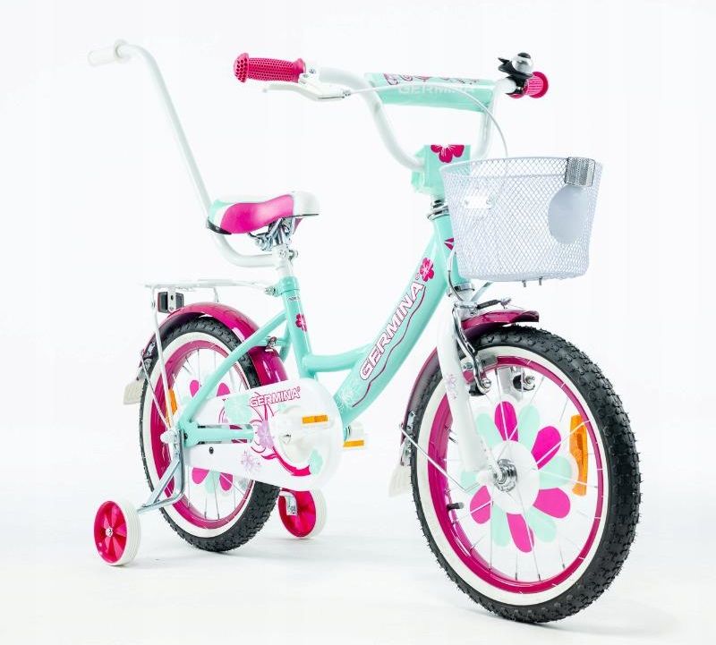 Germina Turkusowy Rowerek Dziecięcy Niebiesk Bmx 16" Prowadnik Kółka Boczne Kosz Przasnysz