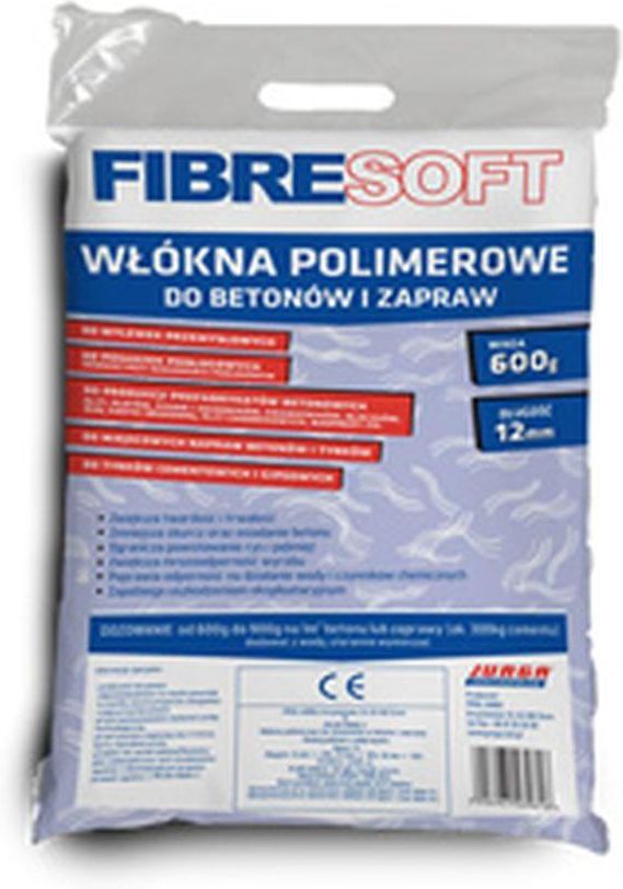 Mikrozbrojenie FIBRESOFT JURGA 600g – włókna polipropylenowe do betonu, prefabrykatów i posadzek – redukcja pęknięć i skurczu Jurga FIBRESOFT to innowacyjny produkt w postaci włókien polimerowych, które stanowią doskonały dodatek wzmacniający do produkcji różnego rodzaju betonowych konstrukcji, w tym posadzek betonowych i wylewek cienkowarstwowych, a także elementów prefabrykatów i galanterii betonowej, takich jak płyty, płoty, krawężniki, nadproża, bloczki, rury, szamba, zbiorniki i wiele innych. Dodatek włókien polimerowych FIBRESOFT zwiększa trwałość betonu, zmniejsza jego skurcz oraz osiadanie, co skutkuje bardziej wytrzymałym i odpornym na pęknięcia materiałem. Zalety produktu Wzmacnianie betonu: Dodatek FIBRESOFT wzmacnia beton, czyniąc go bardziej odpornym na obciążenia i uszkodzenia mechaniczne, co przekłada się na dłuższą żywotność konstrukcji. Redukcja pęknięć: Włókna polimerowe pomagają zminimalizować ryzyko powstawania pęknięć w betonie, co jest szczególnie ważne w przypadku konstrukcji podatnych na skurcz i odkształcenia. Zmniejszenie skurczu i osiadania: Dodatek FIBRESOFT redukuje skurcz i osiadanie betonu, co pozwala na uzyskanie bardziej stabilnych i trwałych konstrukcji. Odporność na korozję: FIBRESOFT jest w pełni wykonany z polipropylenu, dlatego nie powoduje korozji wewnątrz betonu, co jest problemem w przypadku tradycyjnego zbrojenia stalowego. Miejsca zastosowania FIBRESOFT jest doskonałym dodatkiem do betonu w różnych rodzajach konstrukcji, takich jak: Posadzki betonowe: Dodatek FIBRESOFT zapewnia wytrzymałość i odporność na obciążenia w posadzkach, zwłaszcza w miejscach o dużym natężeniu ruchu. Wylewki cienkowarstwowe: Włókna polimerowe poprawiają wytrzymałość i elastyczność wylewek, co jest ważne w przypadku ogrzewania podłogowego. Prefabrykaty i galanteria betonowa: FIBRESOFT zwiększa trwałość różnych elementów betonowych, takich jak płyty, płoty, krawężniki, nadproża, bloczki, rury, szamba, zbiorniki i wiele innych. Sposób Użycia Namoczenie włókien: Przed dodaniem FIBRESOFT do mieszanki betonowej należy je namoczyć w wodzie. To umożliwi dokładniejsze rozprowadzenie włókien w mieszance. Dozowanie: Zaleca się dozowanie FIBRESOFT w ilości od 600g do 900g na 1m³ betonu. Dokładnie wymieszaj, aby zagwarantować równomierne rozprowadzenie włókien. Proba technologiczna: Przed rozpoczęciem projektu konieczna jest próba technologiczna, aby dostosować ilość FIBRESOFT do konkretnego zastosowania i rodzaju betonu. Uwaga: Włókna polimerowe nie zastępują tradycyjnego zbrojenia stalowego. Przechowywanie FIBRESOFT należy przechowywać w suchym i zacienionym miejscu w oryginalnych szczelnie zamkniętych opakowaniach, w temperaturach od +5°C do +25°C. Polski produkt ‘’Jurga Fibresoft’’ to produkt, który w całości jest produkowany w Polsce. Lokalna produkcja umożliwia nadzór nad jakością i elastyczność w odpowiedzi na potrzeby klientów. Wybierając polski produkt, wspieramy rodzimą gospodarkę i promujemy innowacyjność i jakość marek pochodzących z Polski. To także okazja do rozwoju branży budowlanej.