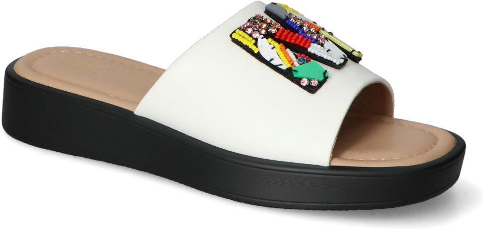 Klapki Jezzi wykonane ze skóry ekologicznej to doskonały wybór dla każdego, kto poszukuje połączenia komfortu i modnego designu. Te klapki wyróżniają się efektownym, kolorowym zdobieniem, które przyciąga wzrok i dodaje energii każdej stylizacji. Białe tło podkreśla barwne elementy, co sprawia, że klapki idealnie komponują się z letnimi sukienkami, szortami czy plażowymi strojami.Model Jezzi charakteryzuje się wygodnym krojem, który zapewnia łatwe zakładanie i zdejmowanie. Szeroki pasek z przodu stabilizuje stopę, a miękka wkładka gwarantuje komfort noszenia przez cały dzień. Lekka podeszwa nie tylko dobrze amortyzuje, ale także umożliwia swobodne poruszanie się, co czyni klapki idealnym wyborem na codzienne wyjścia.Klapki Jezzi to must-have w letniej garderobie. Zainwestuj w obuwie, które łączy modny wygląd z funkcjonalnością, i ciesz się każdą chwilą spędzoną w tych wyjątkowych klapkach. Dzięki nim Twoje stylizacje nabiorą świeżości i oryginalności.