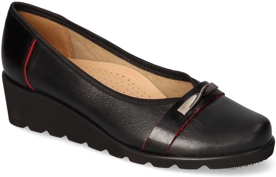 Wyjątkowe półbuty renomowanej marki Galant: - cholewka wykonana została ze skóry naturalnej licowej - wnętrze pokryte zostało materiałem aby zapewnić komfort podczas użytkowania - miękka wkładka wewnętrzna pokryta skórą naturalną - koturn o wys. 4,5 cm zapewnia stabilizację i nadaje elegancji - czarny kolor z dodatkiem czerwieni oraz elegancki fason tworzą efekt, który zachwyci każdą kobietę!