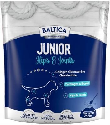 Baltica Junior Hips & Joints 500g Junior Hips & Joints to preparat przeznaczony do uzupełniania diety szczeniąt oraz młodych psów intensywnie rosnących do 18 miesiąca życia. Dostarcza do diety skondensowaną dawkę substancji wspomagających prawidłowe kształtowanie się i rozwój aparatu ruchu (kości, stawów, chrząstek). Junior Hips & Joints to wysoko skoncentrowana mieszanka na stawy dla psów do 18. miesiąca życia. Ma ona za zadanie dostarczać dodatkowych składników odżywczych zwierzęciu, które mają działanie wspierające kondycję stawów, ścięgien, więzadeł oraz chrząstek. Skład: Skład/1000mg: Kolagen typu II 700mg, Siarczan glukozaminy 220mg, Siarczan chondroityny 25mg, Małża Nowozelandzka 20mg. Dodatki dietetyczne/kg: Witamina C (kwas L-askorbinowy) 35000mg Skład analityczny/100g: Białko 61%, Tłuszcze 3,7%, Wilgotność 0,6%, Potas 4,3g, Sód 0,4g Sposób podania: podawać po uprzednim zmieszaniu z pokarmem Dawkowanie dzienne: 1 miarka na 5 kg m.c.