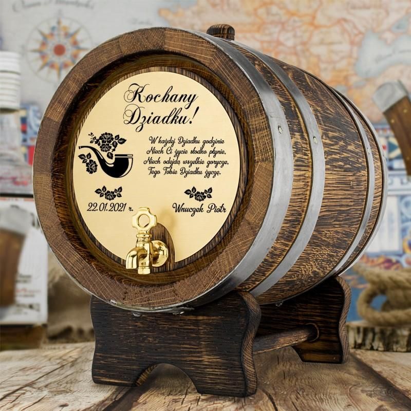 Beczka na alkohol z grawerem dedykacji dla Kochanego Dziadka Dziadek to bardzo bliska Ci osoba. Dobre serce, solidna doza wyrazistego dowcipu i ogromna wiedza którą dzielił się z Tobą odkąd było się małym szkrabem. Co w takim razie można wybrać na wyjątkowy prezent dla dziadka? Świetnie sprawdzi się beczka z grawerem! Na tabliczce naniesiemy Twoją dedykację dla najlepszego dziadka na świecie - dzięki temu dziadek poczuje się wyjątkowo, bo prezent stworzono właśnie z myślą o nim! Nie wahaj się i zamów już dziś! Parametry pojemność: 2 litry kolor: drewno opalane materiał: dąb szypułkowego i bezszypułkowego z terenów Polski uszczelniana liśćmi tataraku bez użycia klejów beczki są wypalane pod mocny alkohol regulowany kranik mosiężny manufaktura ręczna tradycyjny wyrób rzemiosła regionalnego posiada atest Wyrobów Rękodzieła Ludowego i Artystycznego oraz atest PZH polska produkcja wymiary z podstawką: wys. 19.5 cm, szer. 15.5 cm, dł. 23.5 cm (z kranikiem) Personalizacja Aby w pełni spersonalizować produkt, prosimy o przesłanie potrzebnych danych na adres email, a nasi graficy zajmą się resztą :)