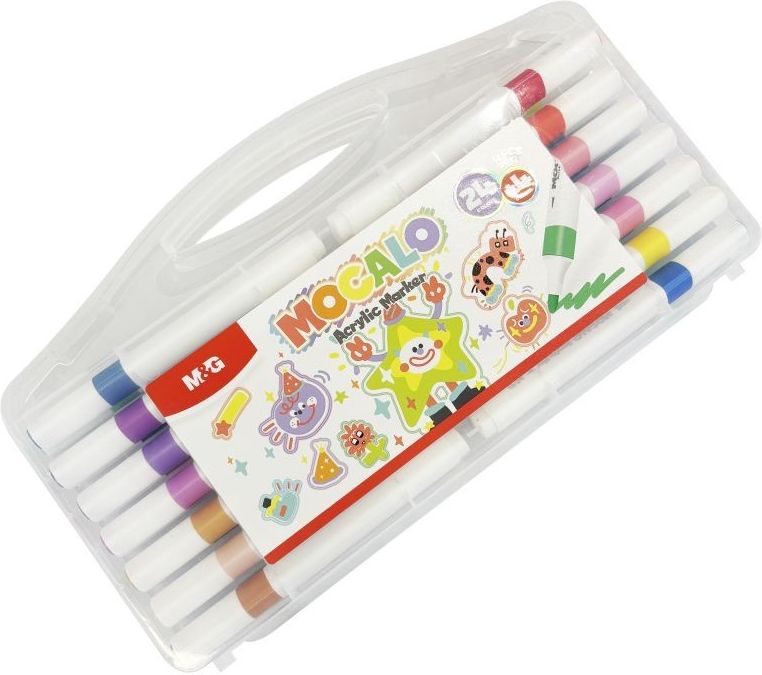 Markery akrylowe M&G Mocalo – 28 kolorów – W kuferku z rączką Uwolnij swoją wyobraźnię z zestawem profesjonalnych markerów akrylowych od renomowanego producenta M&G. Seria Mocalo wyróżnia się niezwykle nasyconymi kolorami i doskonałym kryciem, co czyni je idealnym wyborem zarówno dla artystów, jak i hobbystów zajmujących się rękodziełem (DIY). Dzięki wodoodpornej formule po wyschnięciu, Twoje prace zachowają intensywność barw i trwałość przez bardzo długi czas. Funkcjonalność i kluczowe cechy: Wszechstronność powierzchni: Tusz akrylowy pozwala na dekorowanie drewna, ceramiki, szkła, plastiku, metalu, tkanin oraz kamieni i styropianu. Idealnie nadają się do personalizacji przedmiotów codziennego użytku. Wysokie krycie: Pigment jest gęsty i nieprzezroczysty, co pozwala na nakładanie jasnych kolorów na ciemne tło oraz precyzyjne blendowanie (łączenie) barw przed ich wyschnięciem. Szybkoschnąca formuła: Tusz błyskawicznie wysycha na powierzchni, minimalizując ryzyko rozmazania rysunku podczas pracy, wodoodporny Ergonomiczne opakowanie: Zestaw 28 kolorów zamknięty jest w mocnym plastikowym opakowaniu z wygodną rączką. Kuferek ułatwia przechowywanie markerów w pionie oraz ich bezpieczne transportowanie. trójkątna obudowa zapobiega sturlaniu się z blatu oraz zapewnia wygodny chwyt Parametry techniczne: Producent:M&G Seria:Mocalo Ilość kolorów:28 unikalnych odcieni Rodzaj tuszu: Akrylowy, nietoksyczny Typ końcówki: Uniwersalna (okrągła), precyzyjna Obudowa: Trwałe, białe tworzywo o trójkątnym przekroju z kolorową skuwką ułatwiającą identyfikację barwy Kod produktu:APMT80K5 WP28 Kod EAN:6927036794694 Dlaczego warto wybrać markery M&G Mocalo 28 sztuk? Bogata paleta barw: 28 odcieni pozwala na tworzenie skomplikowanych przejść tonalnych i bardzo szczegółowych ilustracji. Bezpieczeństwo pracy: Tusz jest bezwonny i nietoksyczny, co sprawia, że praca z markerami jest komfortowa nawet w mniejszych pomieszczeniach. Trwałość kuferka: Plastikowe pudełko chroni markery przed wysychaniem i uszkodzeniami mechanicznymi, zapewniając porządek na stanowisku pracy.