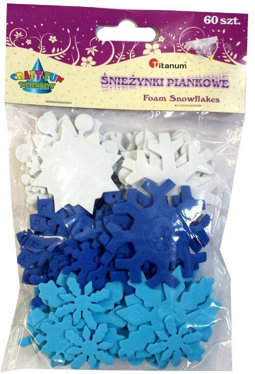 Śnieżynki z pianki w różnych kształtach i 3 subtelnych kolorach. Pomysłowy dodatek do świątecznych i karnawałowych dekoracji oraz prac plastycznych. Cena za 1 opakowanie zawierające 60 śnieżynek.