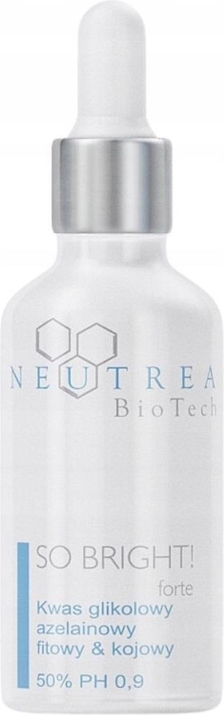 NEUTREA So Bright! Forte Peeling do Twarzy 30ml Zabieg dedykowany do skóry z przebarwieniami różnego pochodzenia, drobnymi zmarszczkami, rozszerzonymi porami. Skutecznie ujednolica koloryt skóry, rozjaśnia przebarwienia, uelastycznia, wygładza i ujędrnia skórę. Redukuje drobne zmarszczki. W swojej formule zawiera kwas glikolowy, azelainowy, fitowy, kojowy. Wersja: 50% PH 0,9 Pojemność: 30ml