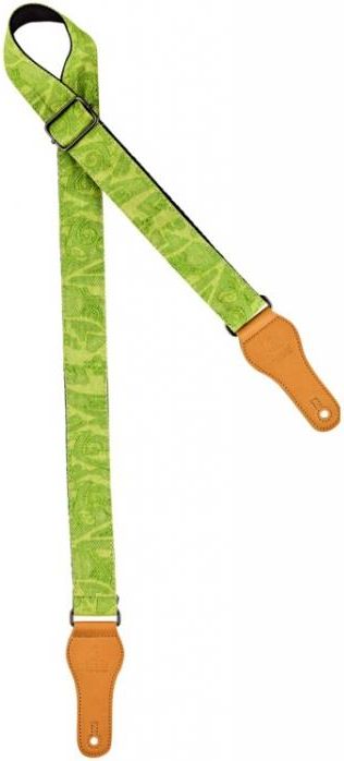 The SPRING SERIES – made from 100% cotton comes for guitar in 49 mm (1,93") width and up to 1580 mm (62,2") length and for ukulele in 37 mm (1,45") width and up to 1390 mm (54,33") length. The strong but flexible faux leather ends fit all types of strap pins and feature an embossed logo. Available in seven different motifs. Pattern: green