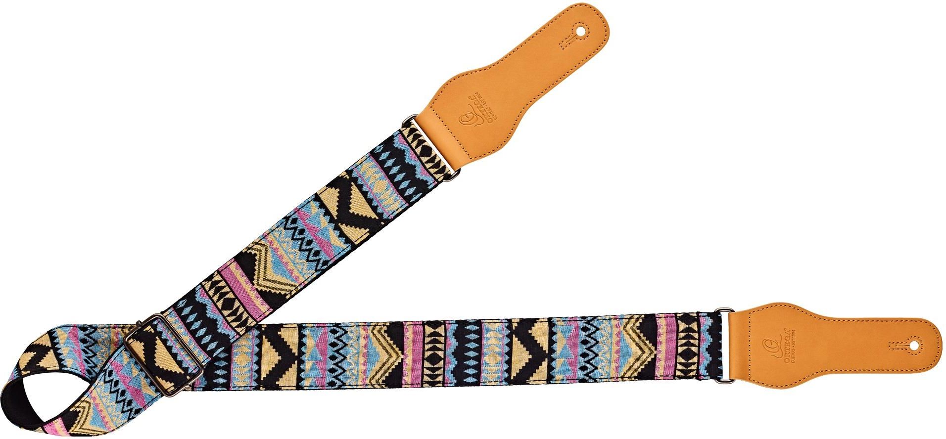 The WORLD SERIES – made from 100% cotton comes for guitar in 49 mm (1,93") width and up to 1580 mm (62,2") length and for ukulele in 37 mm (1,45") width and up to 1390 mm (54,33") length. The strong but flexible faux leather ends fit all types of strap pins and features an embossed logo. Available in eight different patterns. Pattern: andean sky