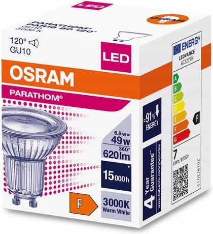 Żarówka LED HALOGEN GU10 6,9W = 49W 3000K 120° OSRAM PARATHOM ŻARÓWKA LED GU10 6,9W 3000K 620lm OSRAM. Jest to źródło światła z trzonkiem GU10 o mocy 6,9W (odpowiednik klasycznej żarówki o mocy 49W). Halogen ten emituje ciepłą barwę światła 3000K o strumieniu świetlnym 620lm. Dzięki wykorzystaniu …