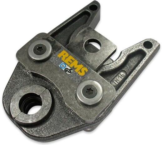 REMS CĘGI, PIERŚCIENIE, SZCZĘKI ZACISKOWE TH16 570460 Bardzo wytrzymałe cęgi zaciskowe z kutej i odpowiednio obrabianej stali specjalnej. Kontury zaciskowe cęgów REMS są specyficzne dla każdego systemu i odpowiadają konturom poszczególnych systemów zaciskowych. Zapewnia to bezproblemowa zgodność i pewne zaciskanie. Szczeki cęgów zaciskowych są precyzyjnie obrobione w Centrum Maszyn Sterowanych Numerycznie i maja maszynowo wygładzony kontur. Gwarantuje to znacznie mniejszy współczynnik tolerancji niż przy konturach tylko odlewanych. Napęd za pomocą wszystkich pras promieniowych firmy REMS (poza REMS Mini-Press ACC) i odpowiednich pras promieniowych innych producentów. Wszystkie cęgi oznaczone * wyposażono dodatkowo w złącze (Patent EP 1 223 008, Patent US 6,739,172) umożliwiające mocowanie ręcznego napędu prasy promieniowej REMS Eco-Press. Prosimy przeczytać i przestrzegać wskazówek oferenta/producenta systemu dotyczących wbudowania i montażu. Oznaczenia umożliwiające kontrolę wsteczną zgodnie z EN 1775:2007 Cęgi zaciskowe REMS z konturami M, V, SA, B, RN i UP maja wykonane specjalne oznaczenie w konturze zaciskania, które po procesie zaciskania pozostawia trwały znak na zaciśniętej kształtce. Umożliwia to użytkownikowi sprawdzenie po procesie zaciskania czy zostały użyte odpowiednie cęgi do wykonania zacisku. Poprzez umożliwienie kontroli wstecznej, REMS wypełnia zalecenia norm europejskich EN 1775:2007 dotyczących wykonania instalacji systemów zaciskowych do gazu.