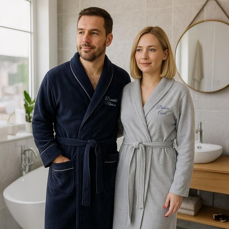 Spraw, aby każdy poranek i wieczór dla Twoich dziadków był dla nich prawdziwą przyjemnością! Wybierz na prezent dla babci i dziadka komplet szlafroków z haftem, które na pewno zostaną przez nich bardzo ciepło przyjęte. Nie tylko ich miękki i przyjemny materiał będzie otulał Twoich ukochanych seniorów, ale i myśl o Tobie i Twojej miłości. Szlafroki z imionami są wymarzonym pomysłem na prezent na dzień babci i dziadka. Parametry w zestawie 2 szlafroki skład materiału: 80% bawełna, 20% poliester gramatura: 240 g/m² pasek do przewiązania haft wykonujemy najnowszymi hafciarkami komputerowymi Szlafrok dla niej rozmiar: L kolor: szary melanż Szlafrok dla niego rozmiar: XL kolor: antracyt Personalizacja Aby w pełni spersonalizować produkt, prosimy o przesłanie potrzebnych danych na adres email, a nasi graficy zajmą się resztą :)