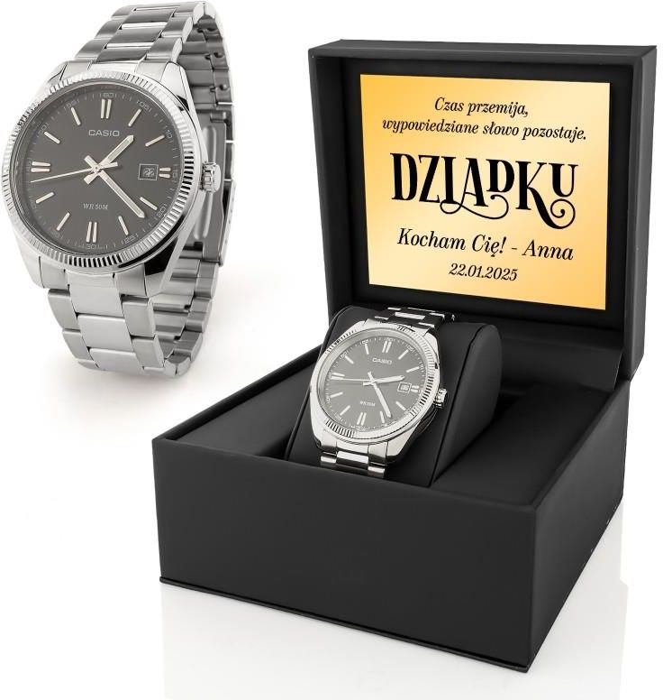 Zachwyć swojego dziadka wyjątkowym zegarkiem męskim Casio MTP-1302PD, który łączy w sobie elegancję, funkcjonalność i niezawodność. Ten stylowy czasomierz to doskonały prezent, który podkreśli jego mądrość i doświadczenie życiowe. Zegarek wyposażony jest w czytelną tarczę, dzięki czemu z łatwością odczyta godzinę w każdej sytuacji. Jego solidna konstrukcja i wysokiej jakości materiały zapewniają trwałość, a klasyczny design sprawia, że pasuje do różnych stylizacji – zarówno formalnych, jak i codziennych. Parametry Zegarek marka: Casio model: MTP-1302D-1A1 kolor bransolety: srebrny kolor tarczy: czarny kształt tarczy: okrągły mechanizm: kwarcowy klasa wodoszczelności: WR50 szkło: mineralne materiał: stal nierdzewna funkcje: datownik, fluorescencyjne wskazówki koperta: 39 x 45 x 9 mm tarcza: 32 mm szerokość bransolety: 18 mm maksymalny obwód: ok. 21 cm Pudełko materiał: skóra ekologiczna wymiary: 11 x 11,5 x 7 cm kolor: czarny wyjmowana poduszeczka wewnątrz tabliczka z dedykacją Personalizacja Aby w pełni spersonalizować produkt, prosimy o przesłanie potrzebnych danych na adres email, a nasi graficy zajmą się resztą :)