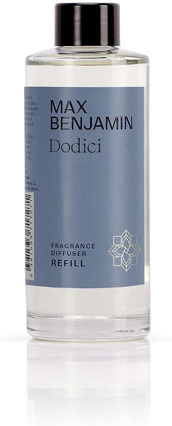 Max Benjamin - Uzupełniacz do dyfuzora 150 ml - Dodici Classic Dodici 150ml- wkład do dyfuzora.Zapach Dodici jest to odtworzenie rozgwieżdżonych nocy spędzonych na odkrywaniu brukowanych sycylijskich uliczek z odurzającym aromatem cytrusów i pachnących ziół unoszących się na ciepłym wietrze. Nuty głowy- cytryny i majeranku zabarwione toskańską lawendą i olejkiem rozmarynowym.Dyfuzory i wkłady do dyfuzorów wystarczą na 4 lub 5 miesięcy.
