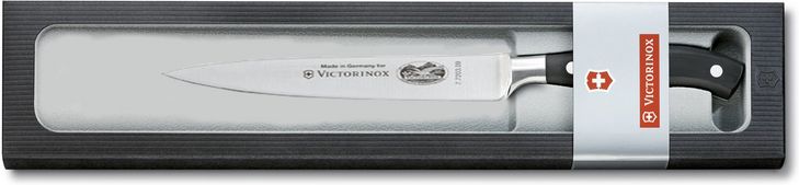 Numer produktu 7.7203.12G Przeznaczenie - uniwersalny Ostrze - gładkie, kute, 12cm Rękojeść - profilowana, nitowana, materiał POM Opakowanie prezentowe Noże Grand Maître. Noże dla zawodowych szefów kuchni i dla kucharzy-amatorów – kolekcja Grand Maître została oparta na koncepcji harmonii. Każdy model z tej popularnej linii posiada jednolitą konstrukcję trzpienia – noże są jednolicie hartowane i kute z jednego kawałka materiału. Dzięki temu przejście od ostrza do rękojeści jest niemal niezauważalne, a sama rękojeść posiada ergonomiczny kształt zapewniający komfort użytkowania nawet podczas wielogodzinnej pracy. Firma Victorinox W 1884 roku Karl Elsener otworzył w miejscowości Ibach, w szwajcarskim kantonie Schwyz, warsztat produkujący noże. Były to czasy, kiedy Szwajcaria była jednym z najbiedniejszych krajów w Europie. W pierwszych latach działania warsztat Elsenera przyczynił się do walki z ubóstwem i bezrobociem w kantonie Schwyz, oferując możliwość pracy i pomagając powstrzymać masową emigrację. W 1891 roku przedsiębiorstwo Elsnera wykonało pierwsze zlecenie dla szwajcarskiej armii, produkując kolekcję noży żołnierskich. Pracę nad nożami oficerskimi i sportowymi – znanymi dziś jako legendarne Szwajcarskie Noże Oficerskie – kontynuowano w 1897 roku. Był to początek rozkwitu firmy, która wkrótce podbiła światowy rynek. Już wtedy widoczne były fundamenty podejścia, które do dziś definiuje filozofię firmy Victorinox – duch solidarności, głębokie zakorzenienie w kulturze regionu i uznanie dla trwałych wartości. Obecnie Victorinox to firma o globalnym zasięgu, mająca w ofercie produkty reprezentujące pięć kategorii: szwajcarskie noże oficerskie, noże domowe i profesjonalne, zegarki, torby i akcesoria podróżne oraz perfumy. Szwajcarskie noże oficerskie to flagowy produkt marki, kluczowy dla rozwoju wszystkich kategorii produktów. Jakość Firma Victorinox gwarantuje, że jej produkty w każdym zakresie spełniają najwyższe standardy jakości, niezależnie od miejsca produkcji. Większość produktów Victorinox – szwajcarskie noże oficerskie, noże domowe i profesjonalne, zegarki oraz perfumy – jest wytwarzana w Szwajcarii. Ze względów technicznych torby i akcesoria podróżne są produkowane za granicą, gdzie dostępne są odpowiednie zasoby ludzkie, materiałowe i technologiczne. Aby zagwarantować najwyższe standardy produkcji, firma starannie dobiera zagranicznych partnerów i wprowadza rygorystyczne wymagania dotyczące jakości. To właśnie wysoka jakość zapewniła firmie Victorinox pozycję lidera, zarówno na rynku szwajcarskim, jak i na całym świecie. Odpowiedzialność społeczna Victorinox AG to niezależna firma rodzinna, w której 90% udziałów posiada Fundacja Victorinox. Gwarantuje to doskonałe zabezpieczenie firmy i trwałość marki – 90% generowanych zysków stanowi rezerwę kapitałową firmy. Pozostałymi 10% udziałów dysponuje fundacja non-profit, która wspiera projekty charytatywne. Wenger – to druga szwajcarska marka w ofercie Victorinox AG Dynamiczny, nowoczesny, zadomowiony w metropoliach tego świata – jednak wciąż wierny szwajcarskim korzeniom. Taki jest Wenger. Marka od ponad 120 lat związana z tradycyjnymi wartościami, ale również z zamiłowaniem do jakości, precyzji i ponadprzeciętnego rzemiosła. Zegarki i akcesoria podróżne z logo Wenger są niezawodne, funkcjonalne i dopracowane – stanowią perfekcyjne odzwierciedlenie aktualnych trendów. To idealny towarzysz osób aktywnych, dla których liczy się elegancki wygląd, a także dla tych, którzy wiele podróżują i którym zależy na jakości w rozsądnej cenie.