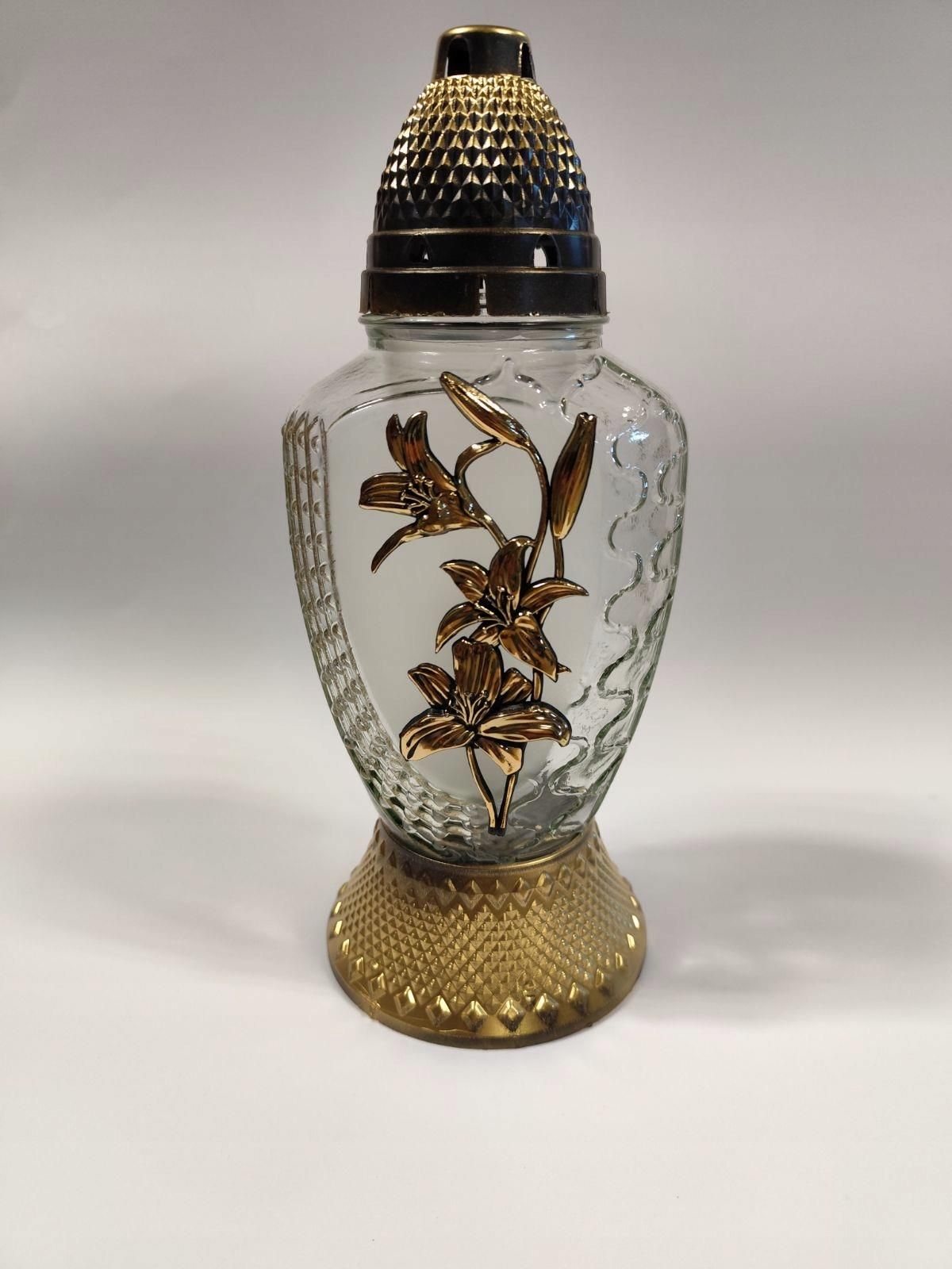 Opis znicz szklany z lilią kolor złoty czapka i spód plastik kolor złoty wysokość 31cm wkład 18cm długość palenia ok 28h pakowane po 6 sztuk wkład w komplecie