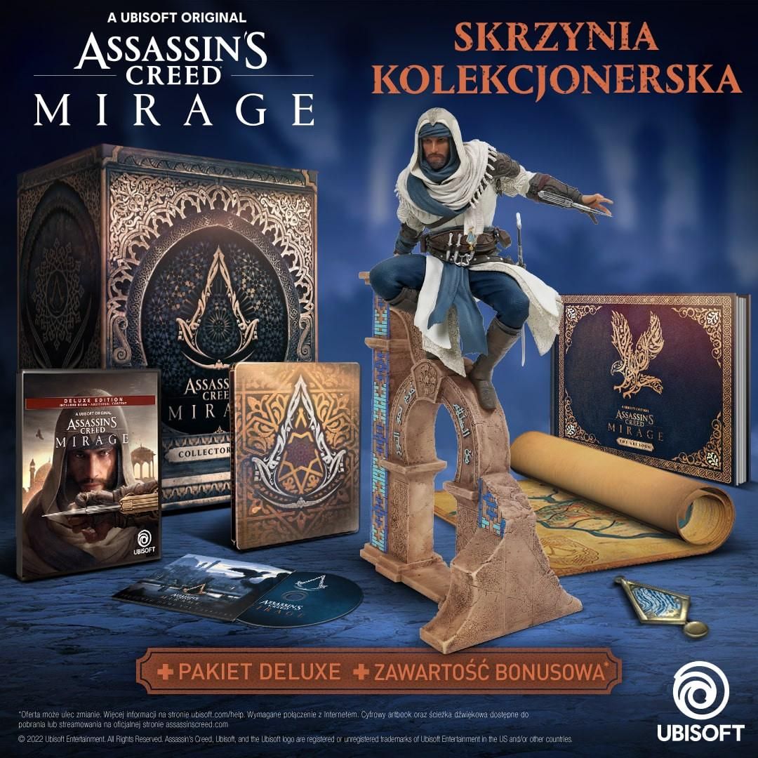 W grze Assassin's Creed Mirage wcielasz się w postać Basima, przebiegłego ulicznego złodzieja z koszmarnymi wizjami, który szuka odpowiedzi i sprawiedliwości.   Poznaj historię Basima, sprytnego złodziejaszka doznającego koszmarnych wizji i poszukującego odpowiedzi oraz sprawiedliwości na gwarnych ulicach Bagdadu z dziewiątego wieku. Tajemnicza pradawna organizacja znana jako Ukryci pomoże mu stać się zabójcą doskonałym i odmienić swój los w sposób, jakiego nie byłby sobie nawet w stanie wyobrazić.       Potężna opowieść o dojrzewaniu Odkryj napędzane narracją doświadczenie action-adventure, które śledzi przemianę buntowniczego młodzieńca w wyrafinowanego Mistrza Zabójców o sprzecznym przeznaczeniu. Poznaj inspirującą obsadę postaci, które ukształtują przeznaczenie Basima i mogą być czymś więcej, niż się wydaje...     Wszechstronny Assassin Zostań najbardziej wszechstronnym Asasynem w historii serii. Płynnie przemierzaj miasto i korzystaj z największego jak dotąd asortymentu narzędzi. Zdobywaj kontrakty w biurach Asasynów, zbieraj ważne wskazówki i ukradkiem likwiduj cele, dokonując bardziej wyrazistych zabójstw niż kiedykolwiek wcześniej.     Wciągające, reaktywne miasto Zbadaj gęste i tętniące życiem miasto, którego mieszkańcy reagują na każdy twój ruch. Odkryj sekrety czterech wyjątkowych dzielnic, od przemysłowego Karkh po bujne ogrody Okrągłego Miasta. Odkryj zaskakujące wydarzenia na świecie i wejdź w interakcję z postaciami historycznymi, które ukształtowały Złoty Wiek Bagdadu.     Hołd dla oryginału Poznaj nowoczesne podejście do funkcji i rozgrywki, które definiowały franczyzę przez 15 lat. Wybierz się w podróż do Alamut, legendarnego domu Asasynów, którzy położyli podwaliny pod Creed w tym serdecznym hołdzie dla gry, od której wszystko się zaczęło.     Pudełko kolekcjonerskie Assassin's Creed Mirage zawiera następujące elementy fizyczne i cyfrowe:   Kopia edycji deluxe Assassin's Creed Mirage, w tym pełna wersja gry oraz zawartość cyfrowa: Edycja deluxe: strój inspirowany grą Prince of Persia, skórki dla orła oraz wierzchowca, broń i nie tylko! Zawartość bonusowa*: cyfrowy artbook i cyfrowa ścieżka dźwiękowa.   Zawartość fizyczna: Pudełko kolekcjonerskie Assassin's Creed Mirage zawiera także zestaw wysokiej jakości przedmiotów kolekcjonerskich, takich jak: wysokiej jakości figurka Basima (32 cm), replika broszki Basima, wyjątkowy steelbook, którego projekt zostanie wybrany przez fanów, miniartbook „The Art of Assassin's Creed Mirage”, mapa Bagdadu, wybrana ścieżka dźwiękowa z gry. *Wymagane połączenie z Internetem. Cyfrowy artbook oraz ścieżka dźwiękowa będą dostępne na oficjalnej stronie Assassin's Creed od chwili premiery gry.