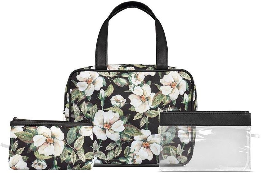 3-part toilet bag set in black print with white flowers. Everything you need; Large cosmetic bag with 2 handles and with interior design consisting of 2 equally sized mesh pockets which give you a good overview of your beauty products, there is also a large zipped pocket. In addition, a makeup bag, for e.g. electronics when you're on the go, or for use as a clutch for a night out. and a check-in bag in PVC-free plastic that complies with the applicable IATA regulations.