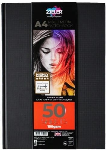 HIGH QUALITY – 50 sheets, 150 g/m², portrait format. The soft white paper with a smooth surface makes it easy to achieve unique depth and fine detail retention when sketching, composing, and developing new ideas. DURABLE HARDCOVER – Classic design. The black microline cover looks stylish and effectively protects your work. The sturdy front cover keeps the paper flat, prevents creases, and provides a stable writing surface even on uneven surfaces or outdoors. SUITABLE FOR MANY TYPES OF MEDIA – With a weight of 150 g/m², the paper is suitable for a wide range of dry media such as pencil, colored pencil, charcoal, graphite, and pastel. It can also be used for ink, water-based markers, and light watercolor washes. The paper has archival quality similar to cotton paper. SUITABLE FOR ALL LEVELS – Perfect for both professionals (artists, graphic designers, and illustrators), budding talents, and students in school, college, or university.