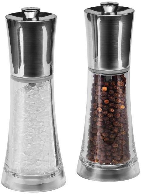 Cole & Mason - Zestaw młynków do soli i pieprzu EveryDay 16,5 cm Komplet do soli i pieprzu EveryDay angielskiej marki Cole & Mason, znanej na rynkach międzynarodowych, jako producenta wysokiej jakości młynków do przypraw. Młynki EveryDay mają wysokość 16,5 cm i są wykonane z przezroczystego akrylu, dzięki czemu możesz kontrolować jaka przyprawa i jaka jej ilość znajduje się wewnątrz. Dodatkowo Twoja przyprawa jest ozdobą stołu! Akryl jest materiałem wysokiej jakości, nie żółknie jak szkło, czy plastik, jest też od nich trwalszy. Oba młynki zostały wyposażone w ceramiczny mechanizm precision, który jest trwały i zarazem odporny na korozję. Młynki EveryDay posiadają regulację mielenia i w łatwy sposób możesz je napełnić przyprawą. Mechanizmy ceramiczne są wysokowydajne i bardzo trwałe, co potwierdza 10-cio letnia gwarancja udzielana przez producenta na mechanizmy mielące. Podczas korzystania z młynków pamiętaj o kilku zasadach: miel tylko sól morską, nie używaj soli kamiennej, która może uszkodzić mechanizm przechowuj pieprz w suchym miejscu, młynek nie zmieli wilgotnego pieprzu podczas mielenia poruszaj mechanizmem zgodnie z kierunkem wskazówek zegara nie używaj młynka nad mocno parującymi potrawami, np. nad gotującą się zupą przy uzupełnianiu młynka przyprawą, odkręć górną śrubę, wsyp przyprawę, nałóż górny element korpusu lekko nakręcając śrubę, a następnie odwróć młynek do góry dnem i lekko potrząśnij, tak aby przyprawa nie znajdowała się w mechanizmie i teraz dokręć śrubę nie dokręcaj śruby do oporu - powoduje to ścieranie mechanizmu i utrudnia mielenie Stosując się do tych kilku zasad, będziesz cieszył się zakupionymi młynkami przez długie lata!