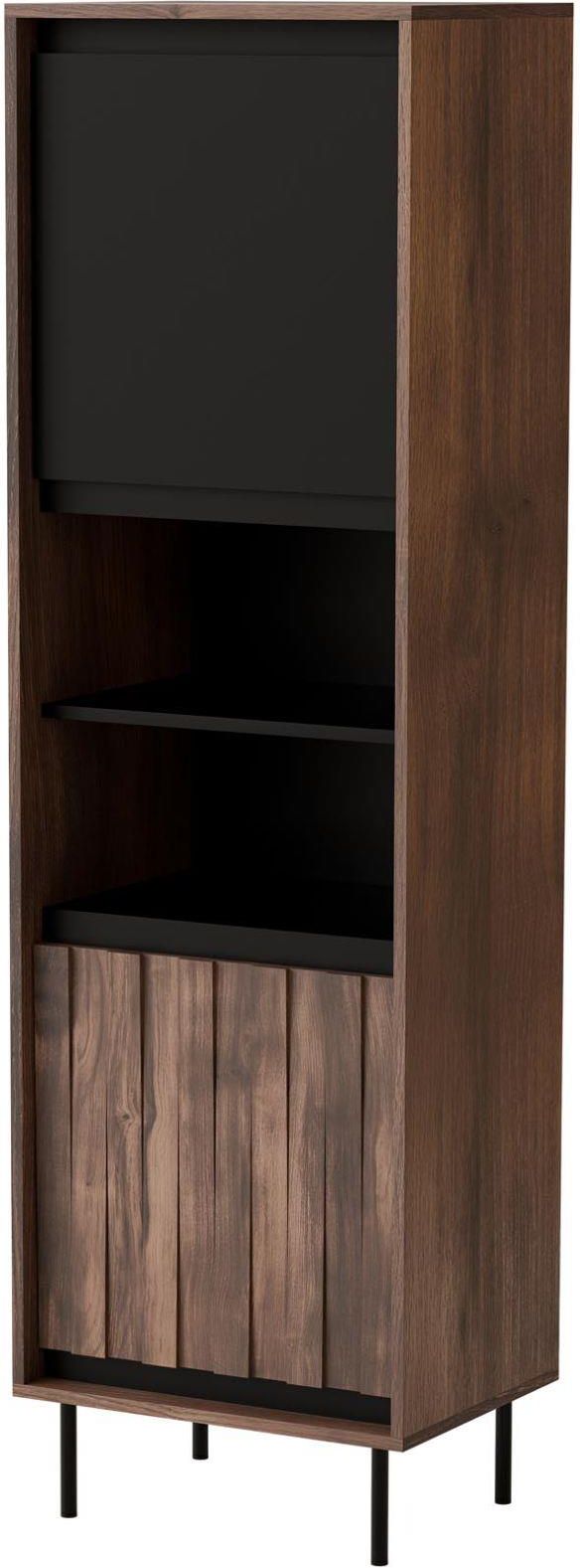 Stylowa witryna do nowoczesnych wnętrz! Witryna Miri w kolorze orzechowym i czarnym to elegancki mebel, który z powodzeniem stanie się centralnym punktem w Twoim wnętrzu. Wykonana z wysokiej jakości płyty meblowej laminowanej oraz MDF foliowanego, witryna łączy w sobie trwałość z estetyką, zapewniając długowieczność i niezmienny wygląd przez lata. Jej orzechowe fronty o strukturze 3D przyciągają wzrok, dodając pomieszczeniu ciepła i wyjątkowego charakteru. Ten mebel jest idealnym rozwiązaniem dla osób, które cenią sobie funkcjonalność połączoną z designem. Wysokość 179 cm oraz głębokość 40 cm sprawiają, że witryna Miri jest nie tylko stylowym dodatkiem, ale również praktycznym miejscem do przechowywania. Jej przemyślany układ wewnętrzny umożliwia wygodne eksponowanie ulubionych przedmiotów, takich jak książki, porcelana czy dekoracje, jednocześnie chroniąc je przed kurzem. Czarny akcent w postaci stalowych, malowanych proszkowo elementów dodaje meblowi nowoczesnego sznytu, który doskonale komponuje się z ciepłym odcieniem orzecha. Dzięki swojej wszechstronności, witryna Miri pasuje zarówno do wnętrz urządzonych w stylu klasycznym, jak i nowoczesnym, wnosząc do nich elegancję i szyk. To więcej niż tylko mebel – to prawdziwa ozdoba, która nadaje wnętrzu wyjątkowego charakteru. Co musisz wiedzieć przed zakupem? Wykonana z wysokiej jakości płyty meblowej laminowanej i MDF foliowanego, witryna zapewnia długą żywotność oraz odporność na codzienne użytkowanie Witryna oferuje sporo miejsca do przechowywania i eksponowania przedmiotów, takich jak książki, dekoracje czy zastawa stołowa Fronty w orzechowym wykończeniu ze strukturą 3D dodają meblowi głębi i wyjątkowości, czyniąc go nie tylko praktycznym, ale i dekoracyjnym