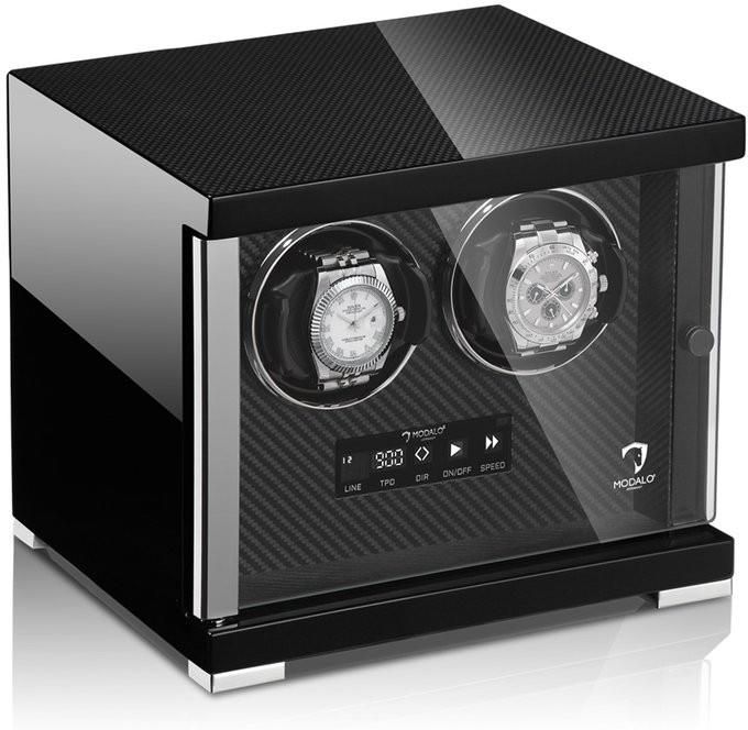 Rotomat to profesjonalne urządzenie do zegarków, które przypadnie do gustu kolekcjonerom, posiadaczom co najmniej dwóch czasomierzy, a także zegarmistrzom oraz przedsiębiorcom, którzy działają w branży luksusowej biżuterii. Służy ono do nakręcania zegarków mechanicznych z automatycznym naciągiem. Bez wysiłku ze strony człowieka, przedłuża żywotność zegarków, dba o ich prawidłowe funkcjonowanie, a do tego pięknie eksponuje poszczególne modele oraz staje się elegancką dekoracją pomieszczenia czy gabloty. CHARAKTERYSTYKA Najbardziej innowacyjna technologia: MODALO oferuje inteligentne programy wind z łagodnymi okresami odpoczynku, opatentowane systemy, oświetlenie wewnętrzne LED, powierzchnię z prawdziwego lakieru fortepianowego, lite drewno z certyfikatem FSC i inne ekskluzywne funkcje. Najnowsze silniki: Silniki MODALO gwarantują delikatne i ciche nakręcanie zegarka, są energooszczędne i trwałe. Każdy silnik można zaprogramować indywidualnie Programy z wyświetlaczem dotykowym: 650 do 1000 TPD (obrotów na dzień) Kierunki obrotu: zgodnie z ruchem wskazówek zegara, przeciwnie do ruchu wskazówek zegara, dwukierunkowo Szybkie nakręcanie: 60 minut obrotu, do szybkiego nakręcania zatrzymanego zegarka) Tryb prezentacji: wszystkie moduły są aktywowane jednocześnie, aby optymalnie zaprezentować zegarki Pozycja na godzinie 12: W okresach odpoczynku zegarek jest optymalnie prezentowany i spoczywa w pozycji na godzinie 12. Oświetlenie LED: Dyskretne oświetlenie wnętrza zegarów LED Wkładki do zegarków: dzięki inteligentnej technologii systemu mocowania wszystkie popularne modele i rozmiary zegarków można bezpiecznie i wygodnie używać. Szkło bezpieczne: Szyba drzwi szklanych wykonana jest ze szkła bezpiecznego ESG Obudowa: Solidna obudowa wykonana z certyfikowanego litego drewna nowozelandzkiego. Wykończenie: wielowarstwowy lakier fortepianowy o wysokim połysku Wnętrze: delikatna skóra syntetyczna, W fakturze Carbon łatwa w pielęgnacji. Zasilanie akumulatorowe: Opcjonalnie możliwa jest praca z 4 akumulatorami typu C Zasilanie: zasilacz 5 V dołączony do akcesoriów Do wszystkich popularnych zegarków automatycznych: waga do 400 g, średnica do 60 mm, długość paska 15-21 cm