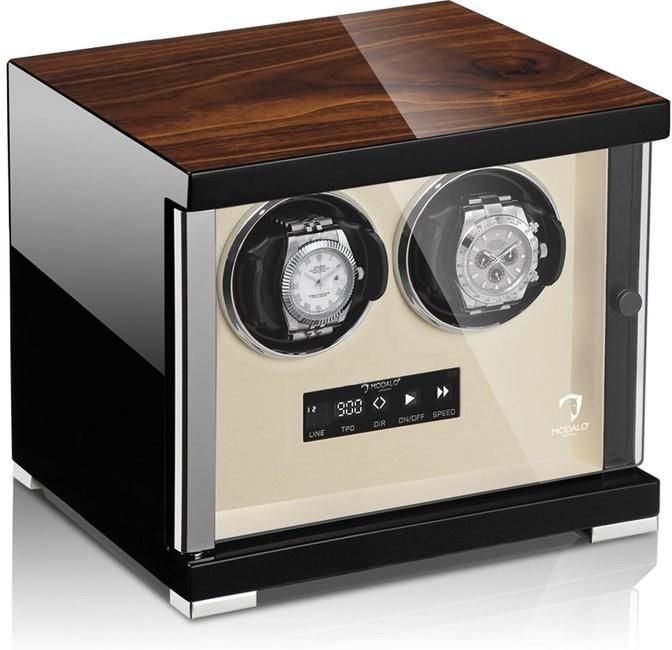 Rotomat to profesjonalne urządzenie do zegarków, które przypadnie do gustu kolekcjonerom, posiadaczom co najmniej dwóch czasomierzy, a także zegarmistrzom oraz przedsiębiorcom, którzy działają w branży luksusowej biżuterii. Służy ono do nakręcania zegarków mechanicznych z automatycznym naciągiem. Bez wysiłku ze strony człowieka, przedłuża żywotność zegarków, dba o ich prawidłowe funkcjonowanie, a do tego pięknie eksponuje poszczególne modele oraz staje się elegancką dekoracją pomieszczenia czy gabloty. CHARAKTERYSTYKA Najbardziej innowacyjna technologia: MODALO oferuje inteligentne programy wind z łagodnymi okresami odpoczynku, opatentowane systemy, oświetlenie wewnętrzne LED, powierzchnię z prawdziwego lakieru fortepianowego, lite drewno z certyfikatem FSC i inne ekskluzywne funkcje. Najnowsze silniki: Silniki MODALO gwarantują delikatne i ciche nakręcanie zegarka, są energooszczędne i trwałe. Każdy silnik można zaprogramować indywidualnie Programy z wyświetlaczem dotykowym: 650 do 1000 TPD (obrotów na dzień) Kierunki obrotu: zgodnie z ruchem wskazówek zegara, przeciwnie do ruchu wskazówek zegara, dwukierunkowo Szybkie nakręcanie: 60 minut obrotu, do szybkiego nakręcania zatrzymanego zegarka) Tryb prezentacji: wszystkie moduły są aktywowane jednocześnie, aby optymalnie zaprezentować zegarki Pozycja na godzinie 12: W okresach odpoczynku zegarek jest optymalnie prezentowany i spoczywa w pozycji na godzinie 12 Oświetlenie LED: Dyskretne oświetlenie wnętrza zegarów LED Wkładki do zegarków: dzięki inteligentnej technologii systemu mocowania wszystkie popularne modele i rozmiary zegarków można bezpiecznie i wygodnie używać Szkło bezpieczne: Szyba drzwi szklanych wykonana jest ze szkła bezpiecznego ESG Obudowa: Solidna obudowa wykonana z certyfikowanego litego drewna nowozelandzkiego Wykończenie: wielowarstwowy lakier fortepianowy o wysokim połysku Wnętrze: delikatna skóra syntetyczna, łatwa w pielęgnacji Zasilanie akumulatorowe: Opcjonalnie możliwa jest praca z 4 akumulatorami typu C Zasilanie: zasilacz 5 V dołączony do akcesoriów Do wszystkich popularnych zegarków automatycznych: waga do 400 g, średnica do 60 mm, długość paska 15-21 cm