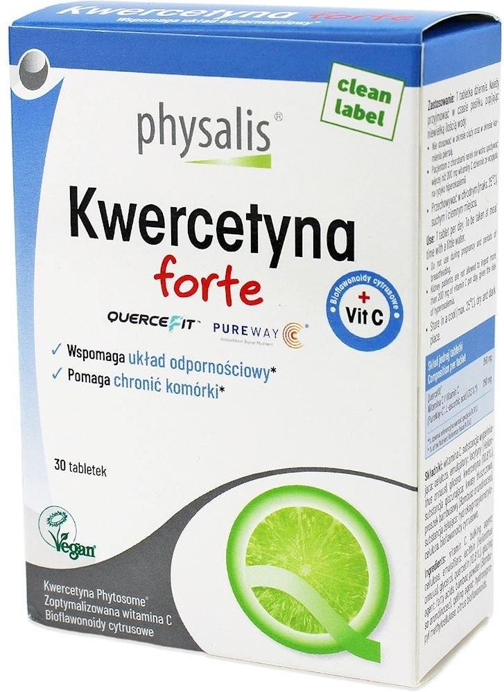 Opis produktu Physalis Kwercetyna Forte to suplement diety zawierający innowacyjny kompleks Quercefit® – standaryzowaną formę kwercetyny Phytosome® – oraz witaminę C PureWay-C® o wysokiej biodostępności. Składniki te wspierają funkcjonowanie układu odpornościowego oraz przyczyniają się do ochrony komórek przed stresem oksydacyjnym. Kwercetyna to naturalny flawonoid występujący w wielu roślinach, znany ze swoich właściwości przeciwutleniających. W połączeniu z witaminą C tworzy synergiczne wsparcie dla odporności, układu nerwowego i metabolizmu energetycznego. Suplement pomaga również zmniejszyć uczucie zmęczenia i znużenia, co czyni go idealnym uzupełnieniem codziennej diety, szczególnie w okresach obniżonej odporności i stresu oksydacyjnego. Produkt nie zawiera glutenu ani cukru w składnikach i jest odpowiedni dla wegan i wegetarian. Wyprodukowany w Belgii przez markę Physalis. Sposób użycia 1 tabletka dziennie. Należy przyjmować w czasie posiłku, popijając niewielką ilością wody. Zalecana dzienna porcja do spożycia 1 tabletka dziennie. Składniki Witamina C, substancja wypełniająca: celuloza, emulgatory: lecytyny (Helianthus annuus), glicerol, kwercetyna (10,8%), substancja glazurująca: kwasy tłuszczowe, proszek bambusowy (Bambusa arundinacea), substancja żelująca: hydroksypropylometyloceluloza, bioflawonoidy cytrusowe. Składniki aktywne Składniki w porcji dziennej (1 tabletka): Quercefit® – 250 mg (w tym kwercetyna – 100 mg), witamina C (PureWay-C®, kwas L-askorbinowy) – 250 mg (313% RWS). Zalecenia dotyczące stosowania Nie należy przekraczać zalecanej porcji do spożycia w ciągu dnia. Suplement diety nie może być stosowany jako substytut zróżnicowanej diety i zdrowego trybu życia. Zrównoważony sposób żywienia oraz zdrowy tryb życia są istotne dla zachowania zdrowia. Przechowywać w miejscu niedostępnym dla małych dzieci. Data ważności: patrz na opakowaniu. Nie stosować w okresie ciąży oraz w okresie karmienia piersią. Pacjentom z chorobami nerek nie zaleca się spożywać więcej niż 200 mg witaminy C dziennie ze względu na ryzyko hiperoksalemii. Zalecane warunki przechowywania Przechowywać w chłodnym (maks. 25°C), suchym i ciemnym miejscu.Przechowywać w sposób niedostępny dla małych dzieci. Kraj pochodzenia Belgia Masa netto 26 g / 30 tabletek Podmiot odpowiedzialny Physalis – tradename of KeyPharm Laboratories, Technologielaan 11B, 8500 Kortrijk, Belgia