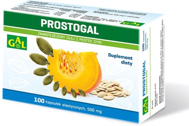 GAL - Prostogal, zimnotłoczony olej z pestek dyni, na układ moczowy, jest preparatem przeznaczonym do codziennego stosowania przez osoby dorosłe w celu uzupełnienia diety w jedno- lub wielonienasycone kwasy tłuszczowe, które stosowane zamiast tłuszczów nasyconych pomagają w utrzymaniu prawidłowego poziomu cholesterolu we krwi. Zawarte w oleju z pestek dyni związki sterolowe wpływają na prawidłowe funkcjonowanie układu moczowego. Składniki: Olej z pestek dyni tłoczony na zimno, żelatyna, glicerol (substancja wiążąca). Zawartość składników na zalecaną dzienną porcję produktu (6 kapsułek): kwasy tłuszczowe nasycone: 0,276g, kwasy tłuszczowe jednonienasycone: 0,504g, kwasy tłuszczowe wielonienasycone: 1,284 g, w tym: Omega-6: 1,284g, fitosterole w przeliczeniu na β-sitosterol: 42mg, białko zawarte w produkcie pochodzi z naturalnych surowców zwierzęcych. Masa netto: 100 kapsułek. Właściwości: Preparat przeznaczony jest dla osób dorosłych jako uzupełnienie codziennej diety w składniki zawarte w oleju z pestek dyni - Niezbędne Nienasycone Kwasy Tłuszczowe z rodziny Omega-6 oraz fitosterole, których suplementacja w codziennym pożywieniu ważna jest zwłaszcza u mężczyzn po 40. roku życia. Olej ten stanowi źródło znacznych ilości nienasyconych kwasów tłuszczowych oraz fitosteroli, które niwelują zaburzenia oddawania moczu występujące u pacjentów z łagodnym przerostem prostaty. Preparat Prostogal 1000 sprawia, że oddawanie moczu staje się łatwiejsze. Redukuje objętość moczu zalegającego i częstość oddawania moczu. Zawarte w oleju z pestek dyni związki sterolowe wpływają na prawidłowe funkcjonowanie układu moczowego. Źródło kwasów z rodziny Omega-6. Zalecane dzienne spożycie: 3 razy dziennie po 2 kapsułki podczas posiłków. Nie należy przekraczać zalecanej porcji do spożycia w ciągu dnia. Produkt nie może być stosowany jako substytut zróżnicowanej diety. Przeciwwskazania: Nadwrażliwość na którykolwiek ze składników preparatu. W okresie ciąży i karmienia piersią przed zastosowaniem należy skonsultować się z lekarzem lub farmaceutą. Przechowywanie: Przechowywać w suchym i chłodnym miejscu, niedostępnym dla małych dzieci. Producent: S.P.R.P. GAL L.P.M.Ł. Marek s.j. ul. Krótka 4 61-012 Poznań