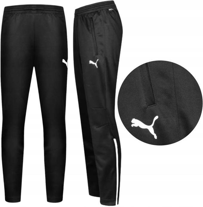 Spodnie marki Puma to wygodna propozycja dla każdego dziecka. Spodnie dresowe od marki Puma. Spodnie zostały wykonane z najwyższej jakości materiałów syntetycznych (100% poliester). W spodniach zastosowano technologie dryCELL, która z łatwością odprowadza wilgoć na zewnątrz, zapewniając komfort noszenia. Elastyczny pas z wewnętrznym sznurkiem, gwarantuje doskonałe dopasowanie do ciała. Logo marki na lewej nogawce spodni. Dwie boczne kieszenie zapinane na zamek. Wąskie nogawki. KOLOR: CZARNY ROZMIAR: 128
