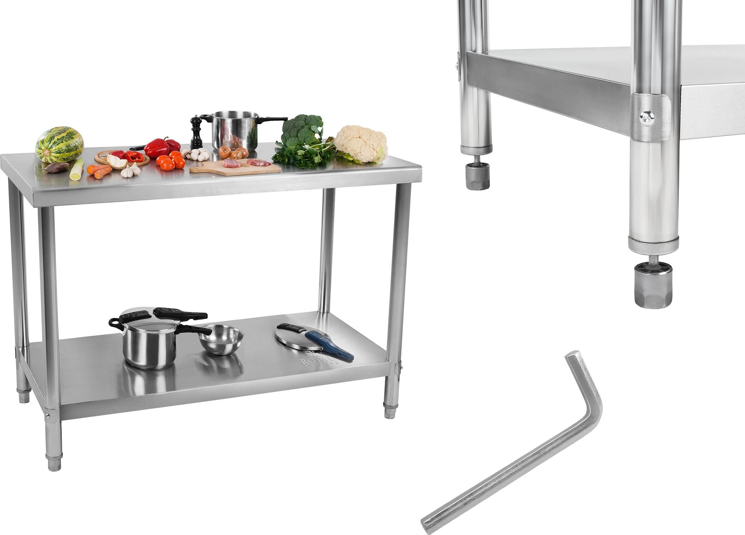 Kod producenta: 10011095Stół gastronomiczny Royal Catering ze stali szlachetnej idealnie nadaje się do pracy w kuchni, ponieważ wykorzystany materiał nie wchodzi w reakcję w żywnością oraz jest znany ze swojej wytrzymałości. Szeroki blat roboczy o wymiarach 100 x 60 cm pozwoli na wygodne przygotowywanie potraw, a zamontowana półka może służyć do przechowywania sprzętu kuchennego. Stabilna konstrukcja stołu gwarantuje, żewytrzyma on obciążenie do 90 kg. Zaokrąglone kanty zapobiegają gromadzeniu się brudu i rozwojowi pleśni. Dodatkowo stół jest wyposażony w regulowane nóżki, które pozwolą na ustawienie optymalnej wysokości. Cechy produktu: Duża powierzchnia robocza - blat roboczy o wymiarach 100 cm x 60 cm Trwałość - konstrukcja ze stali nierdzewnej Wytrzymałość - dwa poziomy o nośności do 90 kg Wygoda użytkowania - półka i zaokrąglone kanty Parametry techniczne: - Model - RCAT-100/60-NW - Nr katalogowy - 10011095 - Stan artykułu - Nowy - Materiał - Stal nierdzewna - Nośność całkowita - 90 kg - Nośność dolnej półki - 25 kg - Nośność górnej półki - 65 kg - Poziomy - 2 - Regulacja nóżek - do 2 cm - Odstęp między półkami - 60 cm - Wymiary dolnej półki - 56 x 96 x 5 cm - Wymiary (DxSxW) - 60 x 100 x 86 cm - Waga - 13,55 kg - Wymiary wysyłki (DxSxW) - 103 x 63 x 14 cm - Waga wysyłki - 15,3 kg W zestawie: Stół roboczy Elementy montażowe Instrukcja PL
