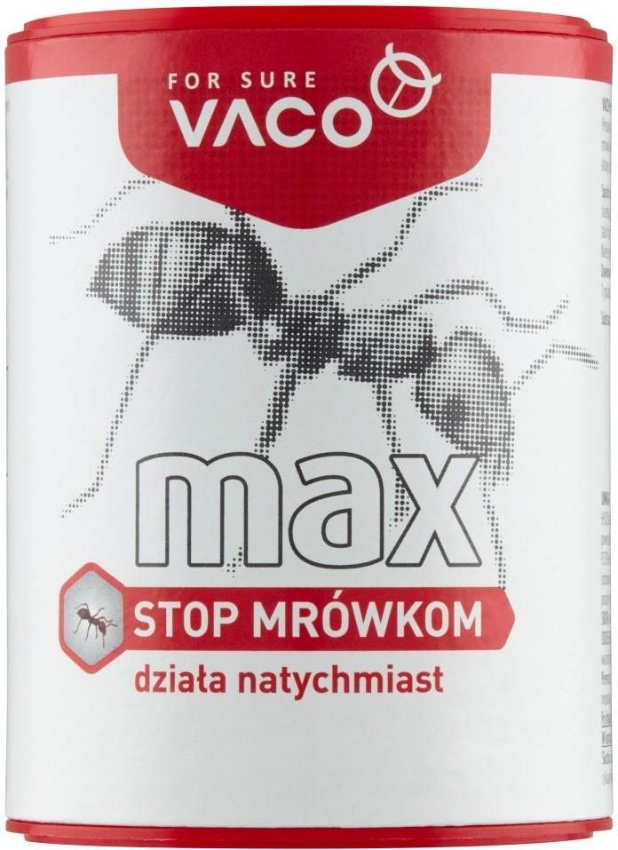 Vaco Max Proszek na mrwki 100 gVaco Proszek na mrwki Preparat owadobjczy w postaci proszku przeznaczony do zwalczania mrwek. Preparat zwalcza mrwki wewnątrz i na zewnątrz pomieszczeń (domy, pomieszczenia piwnicze, krawędzie ścian, altany, chodniki, balkony, podjazdy, betonowe ścieżki itd.). Preparat gotowy do użycia.Sposb użycia: Rozsypywać rwnomiernie widoczną warstwę na powierzchni gniazda i na ścieżkach, ktrymi wędrują owady. Wewnątrz pomieszczeń wsypać niewielką ilość preparatu na tacki i rozstawić w miejscach gromadzenia się mrwek oraz na ścieżkach ich przebiegu. Należy powtrzyć aplikację po każdym usunięciu produktu z miejsca zastosowania.Dawkowanie: 10 g preparatu na 1m powierzchni, na ktrej bytują mrwki lub na 1 gniazdo mrwek. W przypadku zawilgocenia wyłożyć świeżą porcję preparatu.