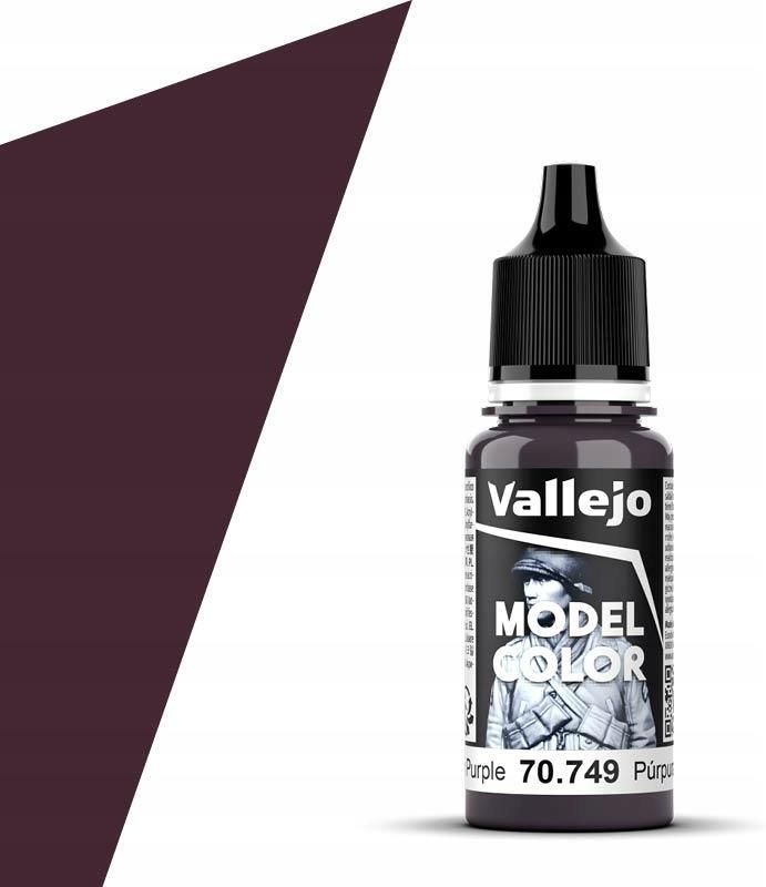 Vallejo 70749 - Farba akrylowa Model Color 049. Dark Purple Buteleczka o pojemności 18 ml, zawiera farbę akrylową z serii Model Color do malowania modeli plastikowych. Farby Vallejo z serii MODEL COLOR Seria farb akrylowych na bazie wody stworzona z myślą o malowaniu modeli plastikowych oraz metalowych przy użyciu pędzelka. Farby sprzedawane są w buteleczkach o pojemności 17 ml z zakraplaczem. Tego typu opakowanie zapobiega parowaniu farby i wysychaniu wewnątrz butelki. Farba nie jest łatwopalna i nie zawiera rozpuszczalników.