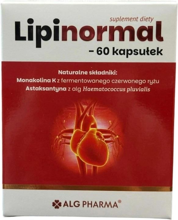 Opis: Lipinormal, kapsułki Lipinormal to suplement diety w formie kapsułek zawierający monakolinę K, astaksantynę, koenzym Q10 i kwas foliowy. Przeznaczony dla osób dorosłych, do stosowania w celu wsparcia utrzymania prawidłowego poziomu cholesterolu we krwi..Składniki: Co zawiera suplement diety Lipinormal? Składnik: 1 kapsułka %RWS* Ekstrakt z czerwonego fermentowanego ryżu, w tym:monakoliny 160 mg2,8 mg -- Bogata w astaksantynę oleożywica z alg Haematococcus pluvialis, w tym:astaksantyna 20 mg0,5 mg -- Polikosanol 10 mg - Kwas foliowy (kwas pteroilomonoglutaminowy) 200 μg 100% Koenzym Q10- 2 mg - *%RWS - Referencyjna Wartość Spożycia Składniki: ekstrakt z czerwonego fermentowanego ryżu, w tym monakoliny; kapsułka (żelatyna, barwnik: węglan wapnia); substancja wypełniająca: celuloza; bogata w astaksantynę oleożywica z alg Haematococcus pluvialis, w tym astaksantyna; polikosanol; substancje przeciwzbrylające: sole magnezowe kwasów tłuszczowych, dwutlenek krzemu; koenzym Q10; kwas foliowy (kwas pteroilomonoglutaminowy)..Właściwości składników: Lipinormal to suplement diety zawierający monakoline K z czerwonego fermentowanego ryżu oraz astaksantynę z alg Haematococcus pluvialis. Produkt wzbogacony o konezym Q10 i kwas foliowy. Kompozycja składników, które pomagają w utrzymaniu prawidłowego poziomu cholesterolu..Zalecane dzienne spożycie: Jak stosować Lipinormal? Dorośli: 1 kapsułka dziennie..Masa netto: 20,1 g (60 kaps. po 335 mg).Dodatkowe: Przechowywać w suchym miejscu, w temperaturze pokojowej. Chronić przed światłem i wilgocią.Suplementy diety powinny być przechowywane w sposób niedostępny dla małych dzieci..Ostrzeżenia: Nie spożywać dziennej ilości równej lub wyższej niż 3 mg monakolin ze sfermentowanego czerwonego ryżu. Niniejszy produkt nie powinien być spożywany przez kobiety w ciąży lub kobiety karmiące piersią, dzieci w wieku poniżej 18 lat i osoby dorosłe w wieku powyżej 70 lat. Należy zwrócić się o poradę do lekarza w sprawie spożycia tego produktu w przypadku wystąpienia jakichkolwiek problemów zdrowotnych. Nie należy spożywać, jeśli zażywasz leki obniżające poziom cholesterolu. Nie należy spożywać, jeśli już spożywasz inne produkty zawierające sfermentowany czerwony ryż. Nie należy przekraczać zalecanej do spożycia porcji w ciągu dnia. Nie stosować w przypadku nadwrażliwości na którykolwiek ze składników. Suplement diety nie może być stosowany jako substytut (zamiennik) zróżnicowanej diety. Zalecany jest zrównoważony sposób żywienia i zdrowy tryb życia. Przed zastosowaniem produktu należy zapoznać się z dokładnymi informacjami podanymi na opakowaniu lub załączonej ulotce. .