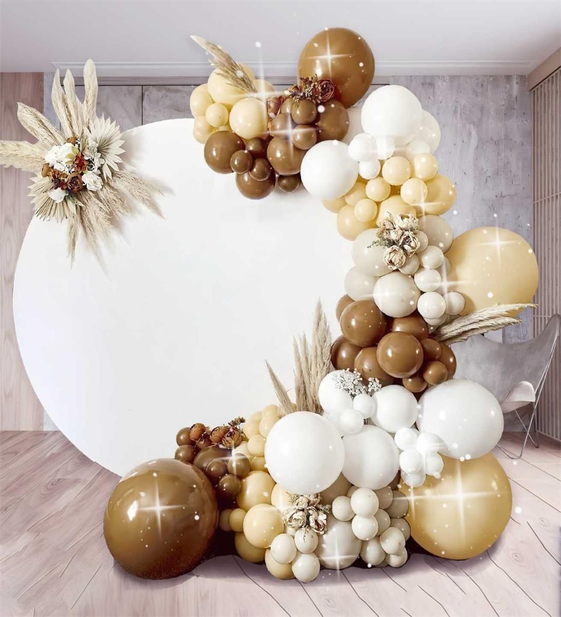 Girlanda balonowa (zestaw), kawowo biała, 101 szt. Gotowy zestaw do stworzenia cudownej dekoracji balonowej. Kolorystyka na tej karcie produktu to: kawowo biała. W skład zestawy wchodzą balony lateksowe (gumowe): 18 cali, brąz 1 szt. 18 cali, cappuccino 2 szt. 10 cali, brąz i cappuccino po 20 szt. 10 cali, odcienie bieli 35 szt,. 5 cali, brąz i cappuccino po 5 szt. 5 cali, odcienie bieli po 5 szt. kropelki kleju wiązadełko do balonów taśmę do girlandy Zestaw jest do samodzielnego montażu i wykonania. Jeśli potrzebujesz pompkę do balonów lub inne akcesoria zapraszamy do Naszych pozostałych ofert. Girlanda balonowa to dekoracja składająca się z balonów, które są przymocowane do siebie za pomocą specjalnej linii lub sznurka ewentualnie taśmy do girland. Zestaw może zawierać różnego rodzaju balony, w różnych kolorach i rozmiarach, oraz akcesoria potrzebne do zawieszenia girlandy. Girlanda balonowa może być używana do dekoracji różnych wydarzeń, takich jak urodziny, wesela, imprezy tematyczne, a także jako ozdoba do pokoju dziecka. Prosty i szybki montaż - girlanda balonowa jest łatwa w montażu i nie wymaga specjalistycznej wiedzy ani narzędzi. Uniwersalność - girlandy balonowe mogą być stosowane na różnego rodzaju wydarzeniach, takich jak urodziny, wesela, imprezy tematyczne. Niski koszt - w porównaniu z innymi rodzajami dekoracji, girlandy balonowe są stosunkowo tanie. Wiele możliwości kreatywnych - girlandy balonowe mogą być tworzone w różnych kształtach, kolorach i rozmiarach, co pozwala na wyrażenie indywidualnego stylu i oryginalności.