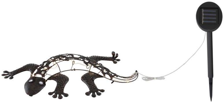 Dane: Lampa solarna metal brąz tworzywo satynowe gekon 2 rodzaje oświetlenia ( migający i stały) IP44 z wyłącznikiem zawiera baterie 1xAA 300mAh 1,2V,Szer*Gł:500x250 Wys:50 zawiera 25xLED 0,06W 3V 3000K Dane techniczne Wysokość (mm): 250 Szerokość (mm): 500 Głębokość (mm): 50 Baterie w komplecie: Tak