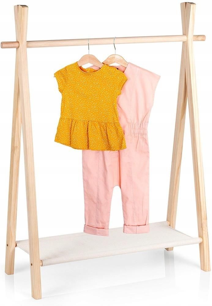 Podłogowy wieszak na dziecięce ubrania - Wieszak stojący na ubrania w formie stojaka, przeznaczony na odzież dziecięcą. Będzie pięknie prezentował się w pokoju dziecięcym lub w sklepie z odzieżą dziecięca. Wieszak ma wymiary 80,5 x 30 x 100 cm Wykonany z drewna sosnowego - Konstrukcja wykonana z drewna sosnowego, a dolna półka z lnu w beżowym kolorze. Stylowy i funkcjonalny - Stojący wieszak dla dzieci jest idealnym rozwiązaniem do przechowywania ubrań, dodatków czy zabawek w dziecięcym pokoju. Dodatkowa półka pozwoli na wygodne przechowywanie butów, torebek i plecaków. Wieszak dziecięcy w stylu tipi nadaje wnętrzu oryginalny, skandynawski charakter, który doskonale komponuje się z pokojem dziecięcym. Solidna konstrukcja i odpowiedni rozmiar - Wieszak jest zaprojektowany w odpowiednim rozmiarze dla dzieci, dzięki czemu dzieci mogą samodzielnie korzystać z niego i łatwo powiesić lub zdjąć ubrania. Solidna budowa zapewnia stabilność i bezpieczeństwo użytkowania. Idealny do codziennego użytku w pokoju dziecięcym. Element dekoracyjny - Wieszak prezentuje się estetycznie i może stanowić efektowny element dekoracyjny w pokoju dziecięcym. Praktyczny wieszak podłogowy w formie stojaka, ułatwia utrzymanie porządku w garderobie dla dzieci. Sprawdzi się do przechowywania ubrań dziecięcych i obuwia. Doskonały do pokoju dziecięcego. Dzięki temu wieszakowi dzieci mogą nauczyć się samodzielnie organizować swoje ubrania, co może być cenne dla ich rozwoju i samodzielności. Oryginalny produkt holenderskiej marki Kids Collection. Wyprodukowano zgodnie z europejskimi standardami. Producent: Kids Collection Sku: 566004 Materiał: drewno Długość: 80,5 cm Szerokość: 30 cm Wysokość: 100 cm Waga (g): 1786 Kolor dominujący: beżowy Logistyka długość(cm): 102 Logistyka szerokość(cm): 12,5 Logistyka wysokość(cm): 15,5 Waga gabarytowa (g): 3060 Kod ean: 8721037334709
