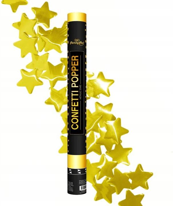 Strzelająca tuba (konfetti) to świetny dodatek na każdą uroczystość. Zaskocz Swoich gości wesela, urodzin, rocznicy niepowtarzalnym efektem spadającego z nieba konfetti. Oferowany model strzela konfetti złote gwiazdki, a tuba ma wysokość 60 cm. Tuby są wykonane z grubego kartonu, a zawartość wystrzeliwana jest dzięki sprężonemu powietrzu. Tuby są bezpieczne i nie posiadają żadnych ładunków wybuchowych. Produkt nie jest przeznaczony dla dzieci. Konfetti tuba to produkt, który wykorzystuje sprężone powietrze do wyrzucania kolorowego papieru na różnego rodzaju imprezy i wydarzenia. Po naciśnięciu spustu, powietrze wypycha konfetti z tuby i unosi go w powietrze, tworząc efektowny i radosny pokaz. Ten produkt jest często używany na imprezach, koncertach, weselach i innych wydarzeniach, aby dodawać animacji i koloru. Efektowne podczas każdej uroczystości Gotowe od razu do łatwego użycia na imprezie Różnorodność kolorów i wzorów