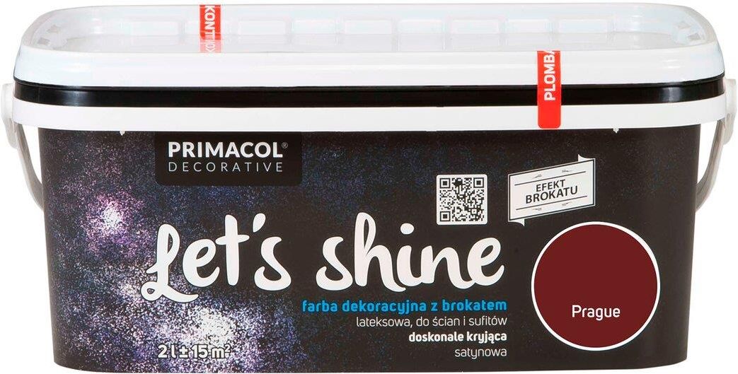 Primacol Farba dekoracyjna Let's shine Prague 2 l Farba dekoracyjna z dodatkiem brokatu Let's shine Prague marki Primacol to lateksowa farba przeznaczona do dekoracyjnego malowania ścian i sufitów. Pozwala uzyskać powierzchnię z efektem mieniącego się brokatu, odpowiadającą najnowszym trendom stylizacji pomieszczeń. Może być stosowana na różnego rodzaju podłoża, takie jak: tynki mineralne i gipsowe, cegły, płyty gipsowo-kartonowe, powierzchnie drewniane i drewnopochodne oraz tapety z włókna szklanego. Doskonale kryjąca, charakteryzuje się wysoką odpornością na zmywanie.