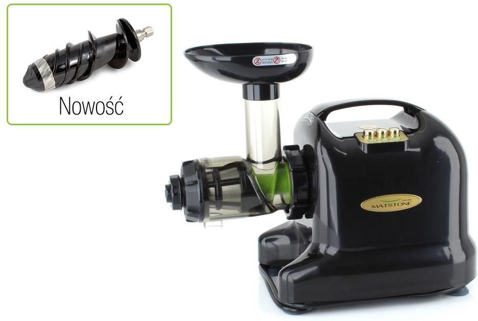 Wyciskarka do soków Matstone 6w1 Advanced w kolorze czarnym Najnowsza wyciskarka do soków z funkcją mielenia Matstone 6 in 1 Advanced czarny to nowoczesne i doskonałej jakości urządzenie przydatne w każdej kuchni, w której przygotowuje się codzienne posiłki z zachowaniem zasad zdrowego odżywiania. Dzięki naturalnym wyciskanym sokom każdy domownik zyskuje dużą porcję naturalnych witamin i związków mineralnych pozytywnie wpływających na ustrój oraz poprawiających urodę. Soki uzyskane dzięki temu rewolucyjnemu urządzeniu można przechowywać nawet do 72 godzin, a wciąż zachowują świeżość i wartości odżywcze. Wyciskarka do soków jest jednym z najnowocześniejszych modeli w serii Matstone, różniącym się od swoich poprzedników wałkiem ślimakowym z ultemu, niezwykłego tworzywa o bardzo dużej trwałości przekraczającej stosowany dotychczas materiał aż ośmiokrotnie. Jest to również tworzywo o wyjątkowej przydatności w kontakcie z żywnością z uwagi na wysoką odporność na reakcje z kwasami owocowymi, tłuszczami i innymi związkami zawartymi w owocach. O przydatności i wysokiej wartości ultemu może świadczyć fakt stosowania go w chirurgii do produkcji niektórych narzędzi. Wyciskarka do soków Matstone 6 in 1 Advanced czarny jest urządzeniem praktycznym, wielofunkcyjnym i estetycznym. Elegancka, wysokiej klasy, zaprojektowana zgodnie z najnowszymi trendami wzorniczymi zewnętrzna chromowa obudowa stanowi dekorację kuchni, dlatego z powodzeniem wyciskarkę można przechowywać na wierzchu w celu jej stałego wykorzystywania. Ogromną zaletą jest też sama konstrukcja urządzenia. Poza mocnym ślimakowym wałkiem wyciskarkę wyposażono także w inne wytrzymałe elementy, w tym niezbędne do oddzielania soku sito. Mocna konstrukcja i trwałe materiały stwarzają wiele możliwości wyciskania soków z owoców twardszych niż zazwyczaj bez ryzyka uszkodzeń sprzętu, czy śladów jego zużywania się. Nowy model Matstone z powodzeniem poradzi sobie z marchwią, jabłkiem czy selerem, ale można w nim także uzyskać sok z miękkich warzyw liściastych, w tym np. natki pietruszki czy szpinaku. Soki pozyskiwane przez wyciskarkę ze względu na sposób tłoczenia zachowują wszystkie pierwotne walory odżywcze bez żadnych strat pierwiastków.Uzyskuje się je dzięki metodzie wolnoobrotowej, podczas której uzyskiwany produkt nie jest poddawany rozwarstwianiu i nie dochodzi do rozbicia cząsteczek różnych cennych substancji. Wyciskarka do sokówMatstone 6 in 1 Advanced pracuje z prędkością 80 obrotów/min. Takie tempo sprawia też, że sok nie zostaje napowietrzony, a więc nie dochodzi w nim do reakcji utleniania przedłużając trwałość napoju. Inną zaletą urządzenia jest dwukrotne filtrowanie, które pozwala na dokładne odseparowanie ewentualnych resztek włókien roślinnych. Dzięki metodzie mielenia owocu przed wyciśnięciem i rozbijania struktury włókien pozyskiwanie soku odbywa się z każdej, nawet najgłębszej warstwy surowca, gwarantując maksymalna wydajność i uzyskanie z tego procesu wszystkiego, co zawiera w sobie owoc lub warzywo. Wyciskarka do soków Matstone 6 in 1 Advanced posiada też możliwość zamontowania specjalnych przystawek, dzięki którym możliwe jest kruszenie lodu czy mielenie twardych orzechów, maku, warzyw lub mięsa na domowe potrawy lub przetwory. Wyciskarka do soków Matstone Advanced posiada wszelkie certyfikaty, charakteryzuje się bardzo cichą pracą i jest zabezpieczone przed przeciążeniami, dzięki czemu nie istnieje ryzyko spalenia silnika podczas mielenia twardych produktów.