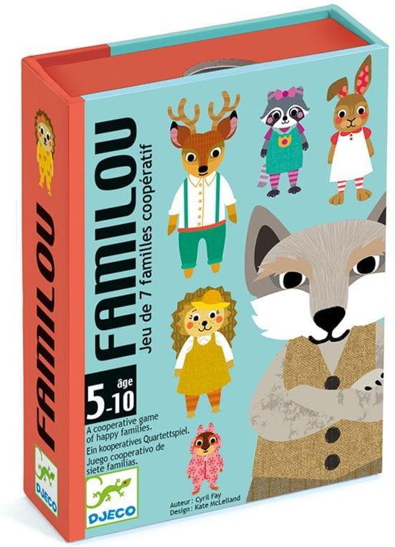 Kooperacyjna gra rodzinna: Wszyscy gracze próbują wspólnie zebrać 7 rodzin zwierzątek zanim pojawi się wilk. Cel gry: zebrać razem 7 rodzin zwierząt zanim złapie nas „WILK”. W czasie trwania gry, gracze mogą dyskutować między sobą o tym, jakie mają karty (nie pokazując ich sobie wzajemnie). Taktyka jest taka, by każdy z graczy grał w taki sposób, by ułatwić położenie karty kolejnemu graczowi i w ten sposób nie blokować gry. Przygotowanie do gry: gdy nadchodzi kolejka, gracz kładzie jedną ze swoich kart na środku stołu. I może: - zacząć układać nowa rodzinę kładąc obojętnie jaką kartę wybranej rodziny na środku stołu, - uzupełnić rodzinę już istniejącą: w tej sytuacji, karta jaką położy musi kontynuować cyfry. Tasujemy karty „zwierzęta” i każdy z graczy dostaje po 3 karty. Pozostałe karty tworzą stosik, który kładziemy na stole, odwróconą stroną, koło graczy. Gramy w kierunku ruchu wskazówek zegara. Zaczyna gracz wybrany przez pozostałych graczy. Przygotowanie gry : Położyć 6 kart „WILK” numerkami do góry: 5 3 1 6 4 2 FAMILOU (Na przykład: jeśli karta 4 z jednej z rodzin leży na stole, to gracz może położyć tylko kartę 3 lub 5 z tej rodziny). Na koniec swojej kolejki, gracz ciągnie ze stosiku jedną kartę i kolejka przechodzi na drugiego gracza. Np. gdy jeden z graczy położy 6-stą kartę jednej : z rodzin, oznajmia „RODZINA” i może nadal grać kolejny raz. Gdy jeden z graczy nie może położyć na stole żadnej karty, odwracamy jedną z 6-ciu kart „WILK”! (zaczynając numerem 1, następnie 2 i tak dalej). Kto wygrywa? Jeśli graczom udało się ułożyć wszystkie, pełne rodziny, wtedy wygrywają wszyscy gracze! Jeśli jednak 6 kart „WILK” zostało odwróconych, to wtedy wygrywa wilk, a pozostali gracze przegrywają. Wiek 5-10 lat Ilość gracz: 2-4 Czas trwania: ok 15 minut Wymiary opakowania: 8,5 x 11,7 x 2,8cm DJECO to znana i lubiana marka francuskich zabawek. Jest to firma z długoletnią tradycją, która oferuje ogromny wachlarz zabawek edukacyjnych: zabawki drewniane dla najmłodszych, super puzzle na każdy wiek, mnóstwo zestawów kreatywnych a także wspaniałe zestawy tematyczne do odgrywania ról. Zabawki Djeco charakteryzują się żywą kolorystyką, wysmakowanym francuskim wzornictwem, wysokimi wartościami edukacyjnymi i kreatywnymi. DJECO to również wspaniałe artykuły dekoracyjne do pokoju dziecka, czyli obszerna seria LITTLE BIG ROOM.