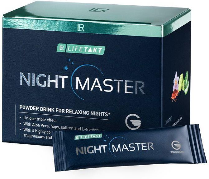 Na Kłopoty z Zasypianiem i Snem - LR NIGHT MASTER ⭐LR Night Master to napój ułatwiających odprężanie, wyciszanie i zasypianie. Przy regularnym spożyciu naturalnie i długofalowo zadba o Twój zdrowy sen. ✅ Z wyjątkowym POTRÓJNYM EFEKTEM: szybciej zasypiasz, głęboko śpisz i budzisz się wypoczęty ✅ Z ważnymi składnikami naturalnymi takimi jak aloes, szafran i ekstrakt z chmielu ✅ Bez efektu przyzwyczajenia: nie uzależnia ✅ Produkt wegański, bez glutenu, laktozy i cukru ✅ Na bazie naturalnych składników czynnych i roślinnych, takich jak aloes, szafran i ekstrakt z chmielu ✅ Night Master LR nie uzależnia, jak tabletki nasenne. ✅ W praktycznym opakowaniu 30 saszetek na 30 dni! Produkt naturalny, którego działanie polega na naturalnym i systematycznym wspieraniu naszego organizmu w produkcji m.in. melatoniny, czyli głównego hormonu odpowiedzialnego za szybkie zasypianie i dobry sen. ----- *Sposób stosowania: Zawartość saszetki rozpuścić w 100 ml wody i wypić 30 minut przed pójściem spać. *Kraj pochodzenia: Niemcy *NAJWYŻSZA JAKOŚĆ! Najlepszy efekt w postaci skutecznego zasypiania uzyskuje się po 40 dniach stosowania suplementu Night Master. ✔Zaśnij szybciej dzięki czystemu odprężeniu. Night Master LR znacząco poprawia się poziom odprężenia już po 40 dniach. ✔Śpij głęboko dzięki lepszej jakości snu. Night Master poprawia znacząco jakość snu, wspierając naturalną produkcję melatoniny. ✔Budź się wypoczęty dzięki zoptymalizowanej regeneracji we śnie. ⭐LR LIFETAKT to najwyższej jakości suplementy diety i indywidualne rozwiązania dopasowane do potrzeb na każdym etapie życia. Niezależnie od tego, czy przechodzisz przez stresujący okres w życiu, brakuje Ci czasu, aby codziennie przygotowywać zbilansowane i bogate w składniki odżywcze posiłki lub chcesz zrzucić wagę – LR LIFETAKT jako Twój kompetentny Partner oferuje dopasowane rozwiązania. Zadbaj o siebie z LR LIFETAKT i żyj w swoim rytmie. Składniki: sole magnezowe kwasu cytrynowego, substancja słodząca (ksylitol), L-tryptofan, barwnik (proszek buraczany), glukonian cynku, ekstrakt z szafranu1 (0,8%), ekstrakt z chmielu1 (0,7%), naturalny aromat, amid kwasu nikotynowego, proszek Aloe vera1 (0,4%), chlorowodorek pirydoksyny, monoazotan tiaminy, metylokobalamina. Producent - LR Health & Beauty renomowane, niemieckie przedsiębiorstwo od 1985 r. posiada najnowsze laboratoria - 65 000 testów rocznie Rada Naukowa z prof. Robertem L. Clancy na czele (immunolog i mikrobiolog) posiada certyfikat jakości najbardziej prestiżowych niezależnych instytutów jakości (SGS Instytut Fresenius, IASC, Dermatest) otrzymuje liczne nagrody przyznawane za wysoką jakość produktów ponad 90% klientów LR uczestniczących w badaniach GfK potwierdziło, że produkty LR Health & Beauty są wyjątkowo wysokiej jakości LR nie testuje produktów na zwierzętach