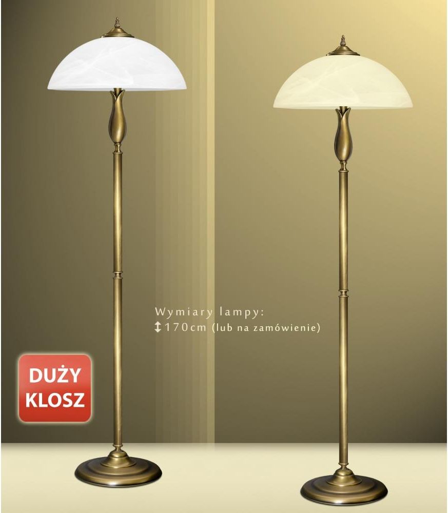 Lampa podłogowa z mosiądzu z dużym kloszem. - Wykonana w całości z elementów z pełnego mosiądzu. - Wykończenie: złota patyna. - Zawiera odlew mosiężny importowany z Włoch. - Klosz szklany do wyboru: biały ‘alabaster’ lub ecru ‘alabaster’. - Wymiary całkowite: wysokość 170cm (lub na zamówienie), średnica klosza 40cm. - W podstawie lampy umieszczony jest odważnik zapewniający jej stabilność.- Włącznik nożny na przewodzie zasilającym (przewód w kolorze lampy wyprowadzony jest z boku podstawy). - Żródło światła: 3xE27 (żarówki tradycyjne/żarowe o mocy max. 60W) lub żarówki energooszczędne albo LED o większej mocy (np. odpowiednik 100W). Lampa jest fabrycznie nowa, wyprodukowana w Polsce. Gwarancja: 24 miesiące. UWAGA! Lampy podłogowe dla pewności i bezpieczeństwa od lat wysyłamy na minipaletach, jak zawsze za 0zł: SZCZEGÓŁY. Seria M - zobacz wszystkie lampy