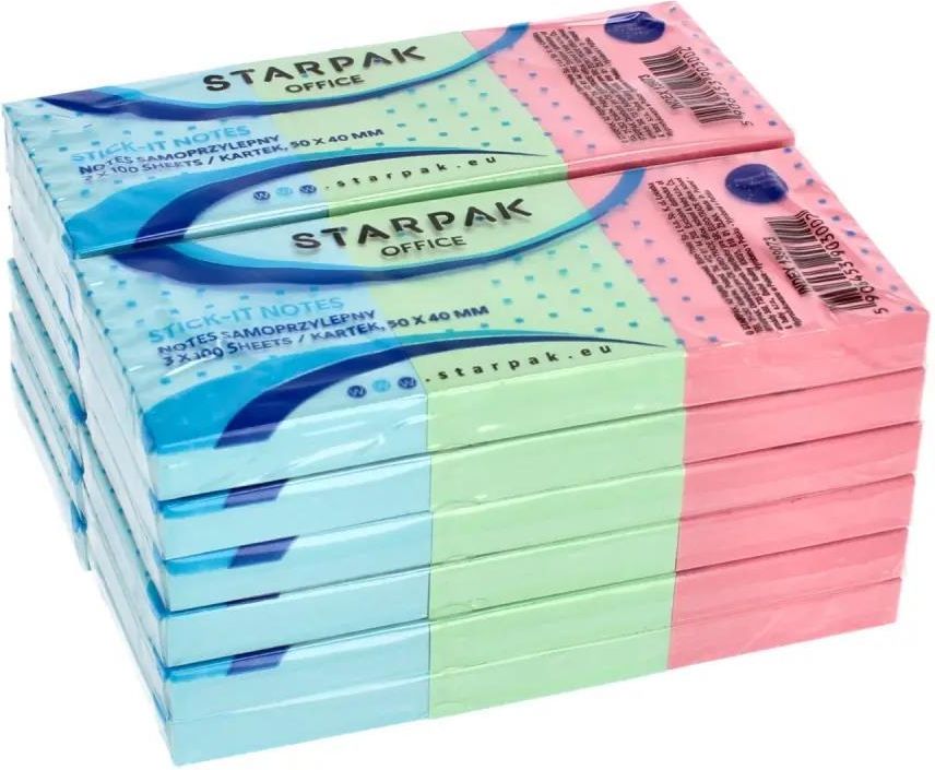 Zalety produktu Bloki karteczek samoprzylepnych STARPAK. Posiada trway klej który sprawi, e karteczki mog wisie na swoim miejscu przez wiele miesicy. Klej nie pozostawia ladów. Odpowiedni kolor karteczek to kompromis midzy jaskrawoci a komfortem dla oka. Zapoznaj si równie z innymi produktami Starpak W zestawie znajduj si 3 bloczki, kady po 100 karteczek, w kolorach róowym, zielonym oraz niebieskim. Produkt przeznaczony dla dzieci w wieku 3 . Wymiary bloczka 50x40mm. Wymiary opakowania wys.x szer.x g. cm 1x12x5. Opis Masa dokumentów to zmora kadego biura. Dlatego waciwa organizacji jest kluczowym elementem, który zapewni sprawne i efektywne funkcjonowanie w kadej filmie. Starpak oferuje 70 artykuów dziki którym mona atwo i logicznie uporzdkowa dokumenty w kadym biurze m innymi - notesy samoprzylepne. STARPAK prezentuje Produkty biurowe - YouTube