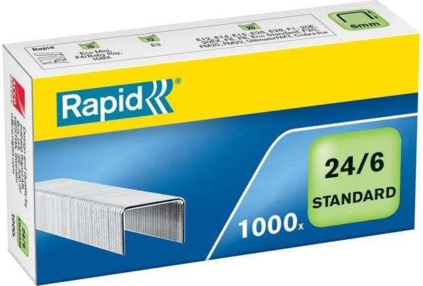 Zszywki 24/6 Standard 1000 sztuk 24855600 RAPID Zszywki wykonane z miekkiego drutu zapewniającego komfort przy zszywaniu do 20 kartek. Galwanizowana powloka zapobiega korozji. Zszywa do 20 kartek. Miekki, galwanizowany drut dla duzego komfortu uzytkowania. Ilośc: 1000 sztuk 7313468556006