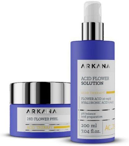 Kwasowa odnowa dzień po dniu - zestaw w promocyjnej cenie! 1 zestaw - 2 programy domowej kwasowej pielęgnacji: - jako silniejsza 28-dniowa kuracja kwasowa - jako delikatniejsza eksfoliacja raz w tygodniu Zestaw niezbędny dla Klientów korzystających z zabiegów z kwasami Zestaw zawiera: 28D Flower Peel 50 ml Kwiatowy żel peelingujący. Progresywny peeling w żelu przygotowujący skórę do aplikacji kremów Arkana z kwasami z kwiatu hibiskusa, jaśminu, stokrotki i wiązówki błotnej oraz kwasem hialuronowym. 28-dniowy program kontrolowanej nocnej eksfoliacji. »» progresywny peeling w żelu »» kompatybilny z dowolnym kremem ARKANA »» po każdej kuracji zalecany miesiąc przerwy przed kolejną aplikacją Pojemność: 50 ml Acid Flower Solution 200 ml Tonik z kwasami kwiatowymi. Formuła toniku rekomendowana dla każdego typu cery, wzmacnia działanie kremów z kwasami dzięki zawartości kwasów z kwiatu hibiskusa, jaśminu, stokrotki i wiązówki błotnej oraz kwasu hialuronowego. Pojemność: 200 ml