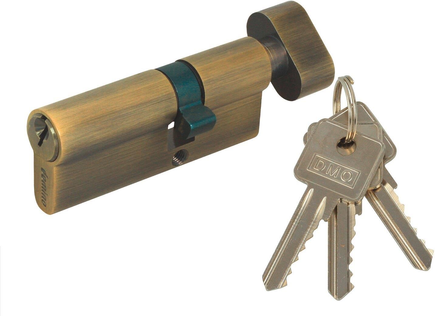 Wkładka bębenkowa DMO 56G/41 - patyna, marki Domino. Jest to popularna wkładka bębenkowa z gałką, którą można montować w szerokiej gamie zamków wpuszczanych. Otwierana z jednej strony kluczem, przeznaczona jest do drzwi zewnętrznych. Wkładka posiada mosiężny cylinder, dzięki czemu nie rdzewieje, nie zacina się, jest trwała i wygodna w użytkowaniu. Kolor mosiądzu patynowanego sprawia, że dobrze komponuje się z większością okuć. Wkładkę cechuje wysoka trwałość mechanizmu - ponad 25 000 cykli. Do wkładki dołączono 3 klucze nacinane. Specyfikacja techniczna Klasa bezpieczeństwa: 3 długość wkładki: 56/41 mm Waga: 341 g Wysokość: 9,7 cm Szerokość: 1,7 cm Głębokość / Grubość: 3,5 cm