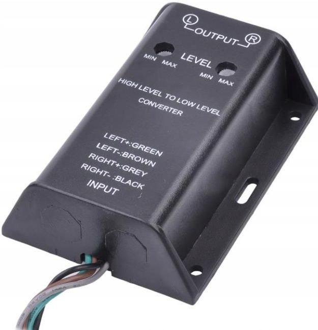 Konwerter sygnału audio High to Low Adapter sygnału audio z wyjścia wzmacniacza mocy (sygnał wysoki HIGH) na sygnał audio z niskim poziomem (LOW). Czyli adapter audio high to low. W praktyce dzięki zastosowaniu adaptera - konwertera poziomów audio mamy możliwość uzyskania poziomu audio zbliżonego do sygnału liniowego. Sygnał audio z adaptera możemy podać na wejście innego wzmacniacza mocy audio. Praktyczne zastosowanie: Najpopularniejszym zastosowaniem konwertera sygnału jest car audio. Większość radioodbiorników samochodowych audio jest zintegrowana z instalacją elektryczną, posiada np. sterowanie z kierownicy, wbudowane systemy głośnomówiące GSM, nawigacje, zegarek itp. Oczywiście fabryczny radioodbiornik jest skomponowany z deską rozdzielczą samochodu i tworzy spójną całość. Jeśli chcemy poprawić jakość dźwięku to najprostszym sposobem jest dołożenie wzmacniacza audio o większej mocy. Zwiększenie mocy wzmacniacza powoduje że cały system audio nawet na tych samych głośnikach lepiej "gra" (zapas mocy przekłada się na mniejsze zniekształcenia dźwięku). Jeśli nasz fabryczny radioodbiornik nie posiada wyjścia liniowego audio to pojawia się problem, ponieważ wyjścia na głośniki nie możemy bezpośrednio podłączyć do wejścia opcjonalnego wzmacniacza mocy. Rozwiązaniem jest zastosowanie oferowanego adaptera sygnału audio. Konwersja polega na transformacji impedancji. Wbudowane transformatory i układ filtrów obniżający sygnał wzmacniacza do regulowanego poziomu audio niskiego. Konwerter sygnału audio możemy również wykorzystać przy rozbudowie systemu o głośnik basowy subwoofer. dane techniczne: dwukanałowy (stero) konwerter sygnału wysokiego na niski poziom sygnału Konwerter sygnału RCA High Level zastępuje brakujące wyjścia cinch w radioodtwarzaczu konwerter stereo: kanał lewy + prawy maksymalna moc wejściowa: 100W wejście: przewody do przylutowania podłączenie do wyjść z końcówki mocy radioodtwarzacza wyjście: gniazda RCA cinch potencjometry do regulacji poziomu wyjściowego (potencjometry do regulacji tłumienia od 0 do 50%) regulacja poziomu sygnału dla każdego z kanałów nie wymaga zasilania (pasywny) plastikowa obudowa wbudowane transformatory impedancji łatwy sposób podłączenia: wpięcie pomiędzy fabryczny radioodbiornik a nowy wzmacniacz wymiary: 90 x 65 x 27mm waga: 90g W załączniku schemat podłączenia