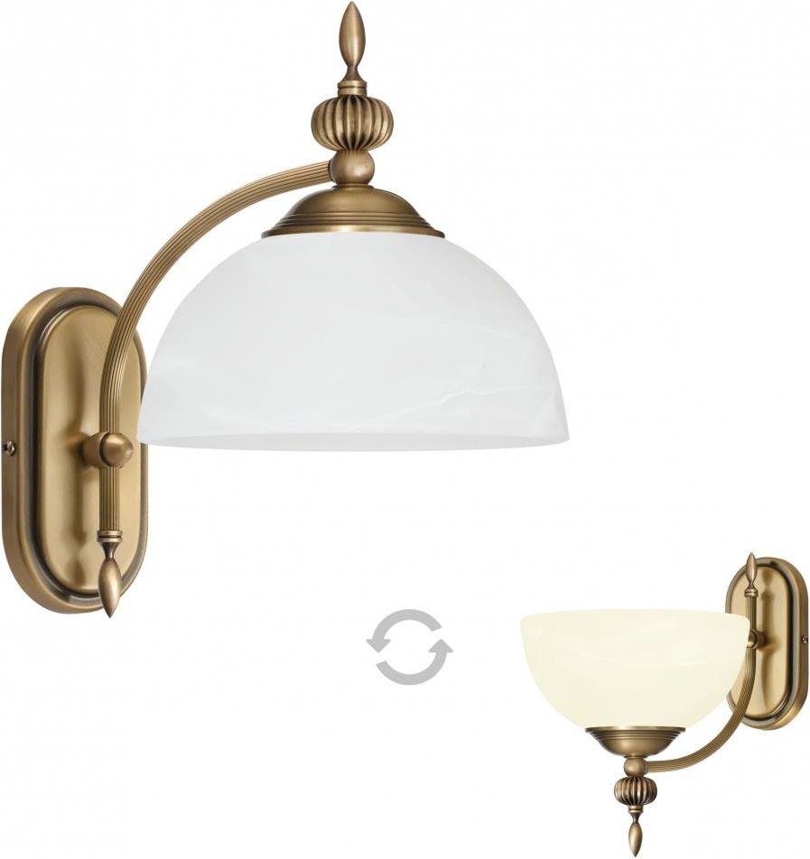 Kinkiet z mosiądzu. - Wykonany w całości z elementów z pełnego mosiądzu. Mosiądz to trwały, szlachetny i ponadczasowy materiał - kliknij, aby dowiedzieć się więcej. - Wykończenie mosiądzu: złota patyna. - Zawiera włoski ozdobny odlew mosiężny. - Uniwersalny montaż: kinkiet może być skierowany kloszem w górę lub w dół. - Klosz szklany do wyboru: biały ‘alabaster’ lub ecru ‘alabaster’ (albo na zamówienie ecru gładki w zależności od dostępności). - Wymiary całkowite: wysokość 30cm, głębokość 25cm, średnica klosza 19cm. - Możliwość zainstalowania włącznika łańcuszkowego (bez dopłaty), opis na dole strony:http://www.mninteriors.pl/lampy-na-zamowienie - Żródło światła: 1xE27 (żarówka tradycyjna/żarowa o mocy max. 60W) lub żarówka energooszczędna albo LED o większej mocy (np. odpowiednik 100W). Lampa jest fabrycznie nowa, wyprodukowana w Polsce. Gwarancja: 24 miesiące. Seria H - zobacz wszystkie lampy