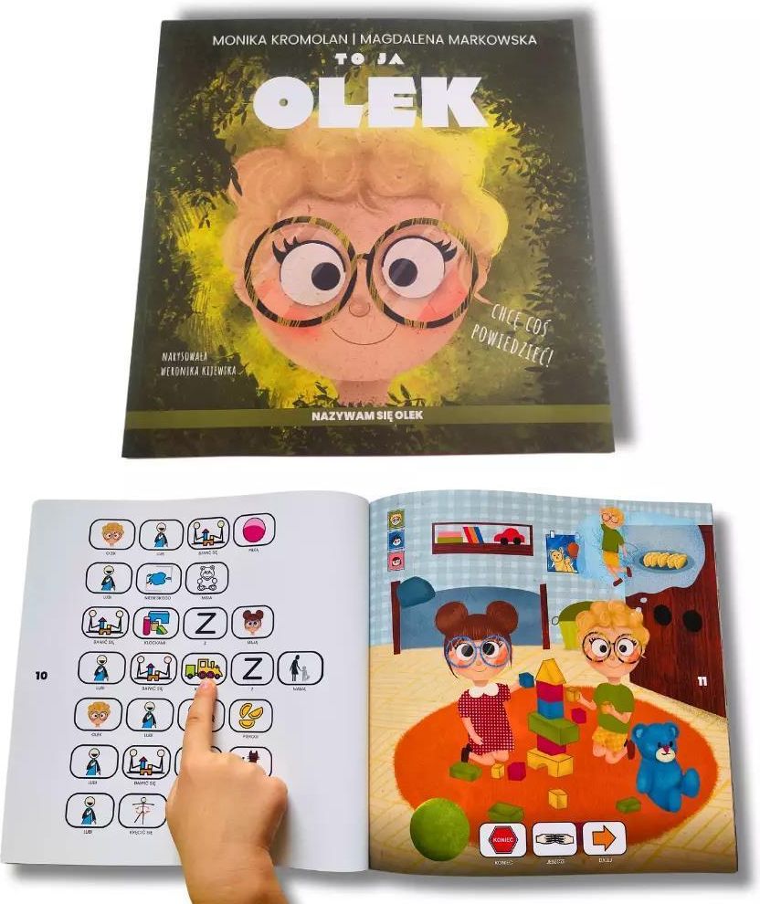 Dla kogo? "To ja Olek" – książka do komunikacji alternatywnej „Książka skierowana jest dla dzieci ze zróżnicowanymi potrzebami rozwojowymi. Jest jedną z niewielu propozycji książkowych, które wspomagają umiejętności komunikacyjne, społeczne i emocjonalne. Zawiera w sobie wiele elementów, które wzmacniają dziecko, rozwijają potencjał, a także umożliwiają nawiązywanie relacji z tytułowym Olkiem oraz rówieśnikami czy osobą dorosłą. Książka ta jest pozycją wartą uwagi, w szczególności dla rodzin posługujących się komunikacją alternatywną, gdyż mogą być piękną okazją do budowania relacji, rodzinnego poczucia bezpieczeństwa oraz wspólnego poznawania nowych umiejętności wizualno-językowych, które z kolei rozwijają komunikację werbalną czy niewerbalną. Książka powinna być wykorzystywana w placówkach, instytucjach, które zajmują się rozwojem dzieci i realizacją ich najważniejszych potrzeb. Szczerze polecam” – dr Sara Knapik Szweda, certyfikowana muzykoterapeutka, pedagog, pracownik naukowo-dydaktyczny UŚ, tutorka i superwizorka. "To ja Olek" jest narzędziem do pracy z dziećmi rozpoczynającymi swoją przygodę z komunikacją alternatywną, jak i do pracy z dziećmi zaawansowanymi komunikacyjnie. Można odczytywać całe zdania jak i korzystać z podanych symboli, tak jak z tablic komunikacyjnych. Z powodzeniem można jej użyć, jako książki do czytania uczestniczącego z dziećmi bez trudności komunikacyjnych. [ikony-produktu-opisy] Dlaczego warto? Książka wykorzystuje symbole do komunikacji alternatywnej pochodzące z systemu MÓWik, dzięki temu jest kompatybilna zarówno z zestawami MÓWik jak i systemem Mówik Print. Olek to niezwykły chłopiec, który odkrywa świat. Dzięki niemu: zbudujesz umiejętności komunikacyjne w oparciu o symbole, rozwiniesz słownictwo dziecka, ćwiczysz skupienie i uwagę. Pozycja ta to także doskonałe narzędzie do czytania uczestniczącego. Olek uczy i doskonali kompetencje społeczne, otwiera na świat i buduje pozytywne relacje. Zaproś Olka do siebie, a stanie się Twoim niezwykłym przyjacielem. Pomysły na zabawę Wykorzystaj w domu, gabinecie, placówce. Jak korzystać: wprowadzasz nowe słowa / symbole książeczka, jako tablica komunikacyjna pomoc dydaktyczno-terapeutyczna (rewalidacja, TUS, logopedia) edukacja domowa doskonały pomysł na indywidualizację edukacja włączająca Główne informacje O autorkach: Monika Kromolan – specjalistka od komunikacji alternatywnej i autyzmu, oligofrenopedagożka. Założycielka terapeutycznego przedszkola Błękitny Domek dla dzieci ze spektrum autyzmu. Dr Magdalena Markowska – psycholożka i pedagożka, specjalistka od autyzmu, nauczycielka akademicka. Popularyzatorka edukacji włączającej. Założycielka Fundacji Instytut Da Vinci oraz przedszkola Akademia Kota Leonarda. Autorka metody edukacyjno-terapeutycznej SPRING do pracy z dziećmi z autyzmem na etapie przedszkolnym. „To ja Olek” Wielkość książki: 28x28cm Ilość stron: 28 ISBN 978-83-968618-0-1