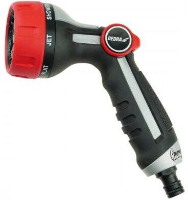 Pistolet zraszający 7 funkcyjny DEDRA 80N253 to rozwiązanie dla osób szukających czegoś więcej niż prosty pistolet do podlewania ogródka. Dzięki dużemu pokrętłu pełniącemu rolę przełącznika funkcji można dostosować siłę strumienia wody oraz wybierać interesujące nas wiązki. Pistolet zraszający DEDRA 80N253 posiada ich siedem: od silnej strugi wody, płaskiego płaszcza wody, centralnie rozchodzącego się płaszcza, funkcji prysznica, kształtu stożka i trybu podlewanie do delikatnej mgiełki. Regulacja natężenia wody sterowana jest kciukiem co jest bardzo wygodne zwłaszcza przy zajętej drugiej. Korpus pistoletu został wykonany z tworzywa ABS i PP ze wstawkami z miękkiego tworzywa TPR. Chwyt został wyprofilowany do kształtu dłoni, zapewnia wysoki komfort użytkowania. Przyłącze pistoletu pod standardową szybkozłączkę 1/2" Cechy: Wykonany z mocnego tworzywa ABS i PP Regulowane dysza ze stopu cynku Pistolet zraszający z 7 funkcjami Regulacja natężenia wody kciukiem Możliwość regulacji kształtu strumienia wody Przystosowany do szybkozłączek Dane techniczne: Przystosowany do szybkozłączki 1/2" Produkcja w Tajwanie / Made in Taiwan Materiał wykonania: korpus ABS+PP+TPR, dysza: cynk Specyfikcja techniczna: EAN: 5902628801333 Marka: DEDRA GARDEN Symbol: 80N253K Kod producenta: 5902628801333 Filtr: Nie Ilość funkcji zraszania: 7 Regulacja stopnia zraszania: TAK Rodzaj: Zraszacz pistoletowy Seria: Garden DEDRA Średnica przyłącza [cale]: 1/2